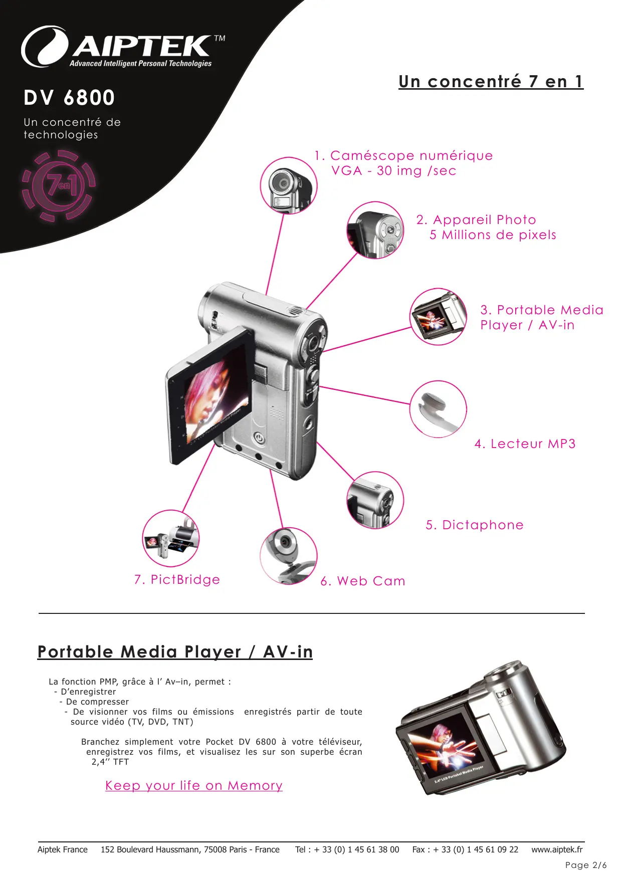 Portable Media Player / AV-in La fonction PMP, grâce à l’ Av–in, permet : - D’enregistrer - De compresser - De visionner vos films ou émissions source vidéo (TV, DVD, TNT) enregistrés partir de toute Branchez simplement votre Pocket DV 6800 à votre téléviseur, enregistrez vos films, et visualisez les sur son superbe écran 2,4’’ TFT Keep your life on Memory Aiptek France 152 Boulevard Haussmann, 75008 Paris - France Tel : + 33 (0) 1 45 61 38 00 Fax : + 33 (0) 1 45 61 09 22 www.aiptek.fr Page 2/6 DV 6800 Un concentré de technologies Présentation Le Pocket DV 6800, un caméscope 7 en 1 mais ultra mince ! Technologiquement avancé, le Pocket DV 6800 sait tout faire… Sans pour autant vous encombrer ! Camescope MPEG-4 /30 img/s Avec le Pocket DV 6800, vous allez faire des vidéos sonorisées avec une résolution VGA au format MPEG 4, et cela avec un confort d’utilisation incroyable, puisqu’il est équipé d’un stabilisateur numérique ! Appareil Photo 5 millions / Night shot Prenez également des photos jusqu’à 6 millions de pixels, quelque soit le degré de luminosité grâce à son flash intégré et surtout à son mode nuit. En effet, pour la première fois, Aiptek intègre à un caméscope un mode permettant de filmer dans la pénombre. Ecran 2.4’’ LTPS / Batterie Lithium Le Pocket DV 6800 s’offre un superbe écran 2.4’’ TFT LCD qui est rotatif à 270° ! Filmez et photographiez sous tous les angles, voilà une autre bonne idée du Pocket DV 6800 ! Toujours pour plus d’aisance, le Pocket DV 6800 adopte une batterie LI-ION, pour éviter l’achat perpétuel de piles alcalines, mais surtout pour atteindre 3 heures 30 d’autonomie ! Lecteur MP3 Ce n’est pas tout, cet appareil dispose de la fonction baladeur MP3. Transférez simplement vos morceaux MP3 dans la mémoire du Pocket DV 6800 et écoutez tranquillement vos musiques préférées sur le haut parleur ou avec le casque stéréo fourni ! Webcam / Dictaphone Enfin, grâce à un simple branchement au port USB de votre ordinateur et à son trépied inclus, le Pocket DV 6800 deviendra une webcam très performante! De plus, le Pocket DV 6800 est également pourvu de la fonction dictaphone, pour tous vos mémos vocaux ! Slot SD / MMC / Compatible jusqu’à 2 Go Pourvu d’une mémoire interne de 16 Mo et d’un port SD / MMC, il fera également office de disque de stockage, vous permettant ainsi d’étendre la mémoire jusqu’à 2 Go ; vous pourrez alors conserver près de 12 heures de films et 4000 photos en 3 millions de pixels ! PictBridge / TV - out De plus, puisque le Pocket DV 6800 n’a rien oublié, il est également doté d’une sortie TV, pour contempler vos meilleurs moments sur votre téléviseur ! Imprimez vos photos sans plus attendre, puisque le Pocket DV 6800 possède un port de connexion direct pour imprimante… Aiptek a pensé à tous ceux pour qui rien ne remplace le tirage papier ! Fonction Portable Media Player (PMP) / AV - in pour encodage direct Parfaitement hybride, cet appareil possède la fonction AV-in, grâce à elle, enregistrez vos émissions de TV préférées ou encore vos DVD favoris, et ce par un simple branchement du Pocket DV 6800 à votre téléviseur ! Bref, votre Pocket DV 6800 devient véritablement un produit multimédia, pourvu de la technologie PMP (Portable Media Player). En plus de son élégance, le Pocket DV 6800 peut être fier de vous offrir enfin toutes les possibilités numériques dont vous rêviez! Aiptek France 152 Boulevard Haussmann, 75008 Paris - France Tel : + 33 (0) 1 45 61 38 00 Fax : + 33 (0) 1 45 61 09 22 www.aiptek.fr Page 3/6 DV 6800 Un concentré de technologies Spécifications Généralités Résolution capteur 3M pixels (2048 x 1536) - CMOS 6M pixels interpolés (2832 x 2128 ) Mémoire interne 32 Mo SDRAM + 16 Mo Flash (stockage) Format MPEG4, JPEG (Images), WAV (Audio), MP3 Ecran 2,4’’ TFT Flash intégré Auto / On / Off et Anti Yeux-Rouges Zoom numérique 4 X (également en fonction caméscope numérique) Type Interface USB 2.0 Taille (en cm) 11 x 7.2 x 3.4 cm Résolution Camescope numérique VGA en MPEG-4 (640 x 480) jusqu’à 30 img/s - 16 Mo interne = 1 minute 30 secondes - SD 1 Go optionnelle = 1 heure QVGA (320 x 240) en 30 img/s - 16 Mo interne = 6 minutes - SD 256 Mo optionnelle = 1 heure Appareil photo numérique Résolution en 3M pixels CCD (2304 x 1728) - 16 Mo interne = 30 photos - SD 256 Mo optionnelle = 480 photos Résolution en 6M pixels interpolés (2832 x 2128) - 16 Mo interne = 11 photos - SD 256 Mo optionnelle = 160 photos Options appareils photo numérique Exposition automatique et balance des blancs Extinction automatique (réglable) Flash regrable avec anti-yeux rouges Mémoire optionnelle extensible jusqu’à 2 Go Aiptek France 152 Boulevard Haussmann, 75008 Paris - France Tel : + 33 (0) 1 45 61 38 00 Fax : + 33 (0) 1 45 61 09 22 www.aiptek.fr Page 4/6 DV 6800 Un concentré de technologies Capacités Capactié de Stockage MEMOIRE Vidéo (minutes) Audio (minutes) Photos Caméra 6 Méga Pixels VGA QVGA Max
