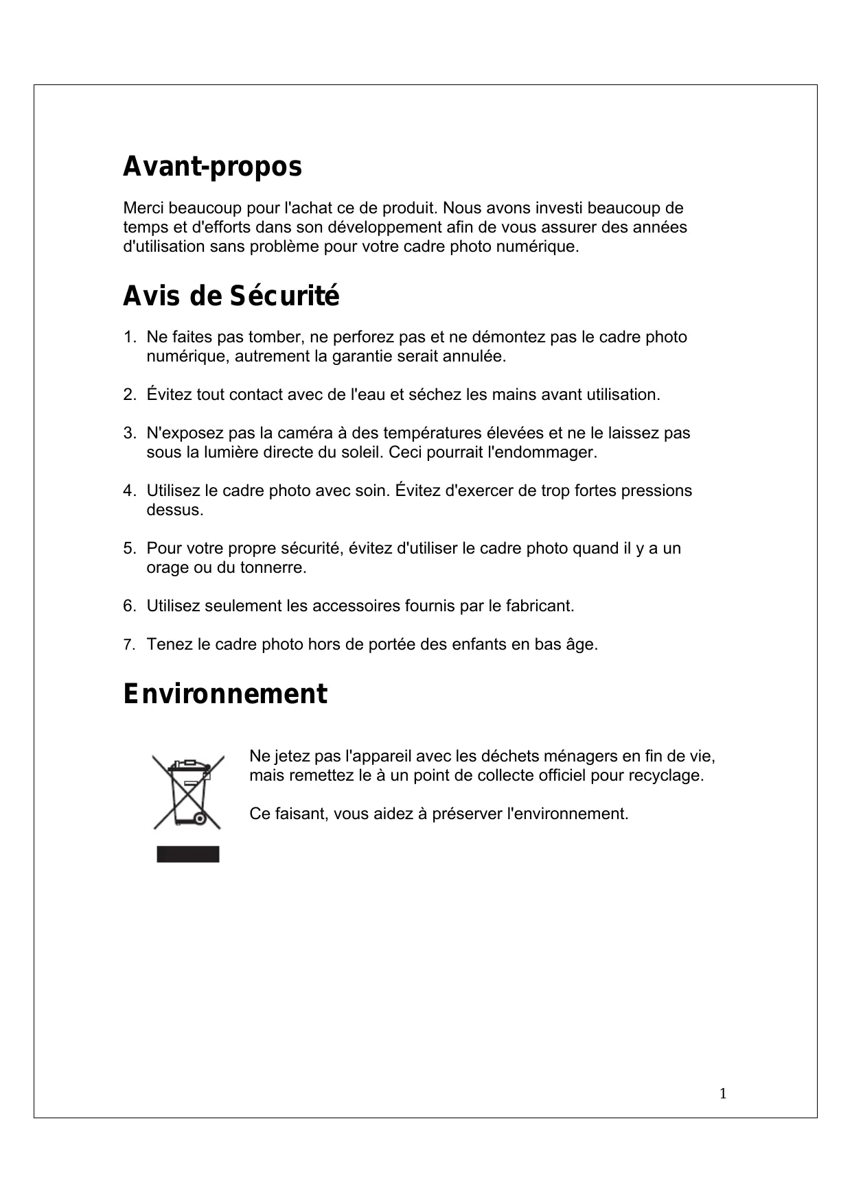 Avant-propos Merci beaucoup pour l'achat ce de produit. Nous avons investi beaucoup de temps et d'efforts dans son développement afin de vous assurer des années d'utilisation sans problème pour votre cadre photo numérique. Avis de Sécurité