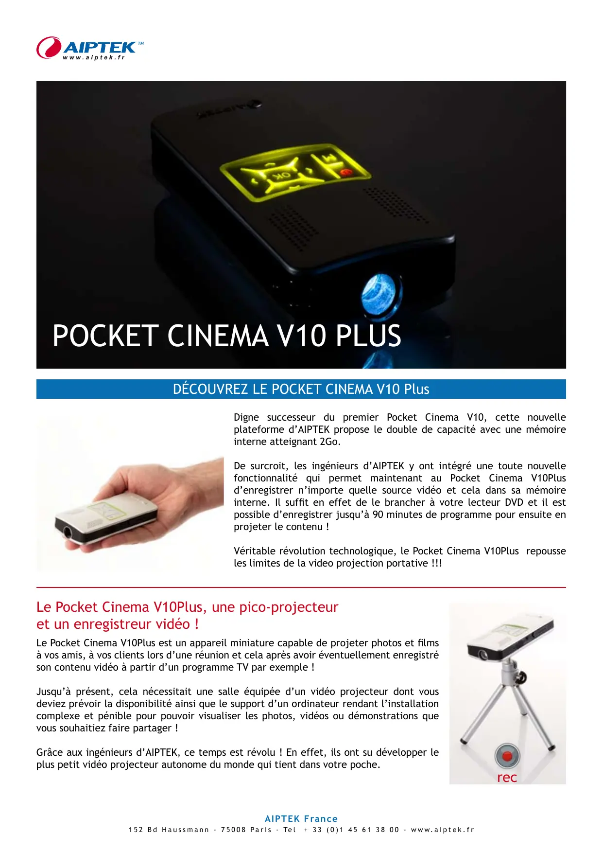 Digne successeur du premier Pocket Cinema V10, cette nouvelle plateforme d’AIPTEK propose le double de capacité avec une mémoire interne atteignant 2Go. De surcroit, Les ingénieurs d’AIPTEK y ont intégré une toute nouvelle fonctionnalité qui permet maintenant au Pocket Cinema V10Plus d’enregistrer n'importe quelle source vidéo et cela dans sa mémoire interne. IL suffit en effet de Le brancher à votre lecteur DVD et il est possible d’enregistrer jusqu’à 90 minutes de programme pour ensuite en projeter le contenu ! Véritable révolution technologique, le Pocket Cinema V10Plus repousse les limites de La video projection portative !!! Le Pocket Cinema V10Plus, une pico-projecteur et un enregistreur vidéo ! Le Pocket Cinema V10Plus est un appareil miniature capable de projeter photos et films à vos amis, à vos clients lors d’une réunion et cela après avoir éventuellement enregistré son contenu vidéo à partir d’un programme TV par exemple ! Jusqu'à présent, cela nécessitait une salle équipée d’un vidéo projecteur dont vous deviez prévoir la disponibilité ainsi que Le support d’un ordinateur rendant l'installation complexe et pénible pour pouvoir visualiser les photos, vidéos ou démonstrations que vous souhaïitiez faire partager ! Grâce aux ingénieurs d’AIPTEK, ce temps est révolu ! En effet, ils ont su développer le (e) plus petit vidéo projecteur autonome du monde qui tient dans votre poche. 152 Bd Haussmann rec - 75008 Paris - Tel + 33 (0)1 45 61 38 00 - www.aiptek.fr