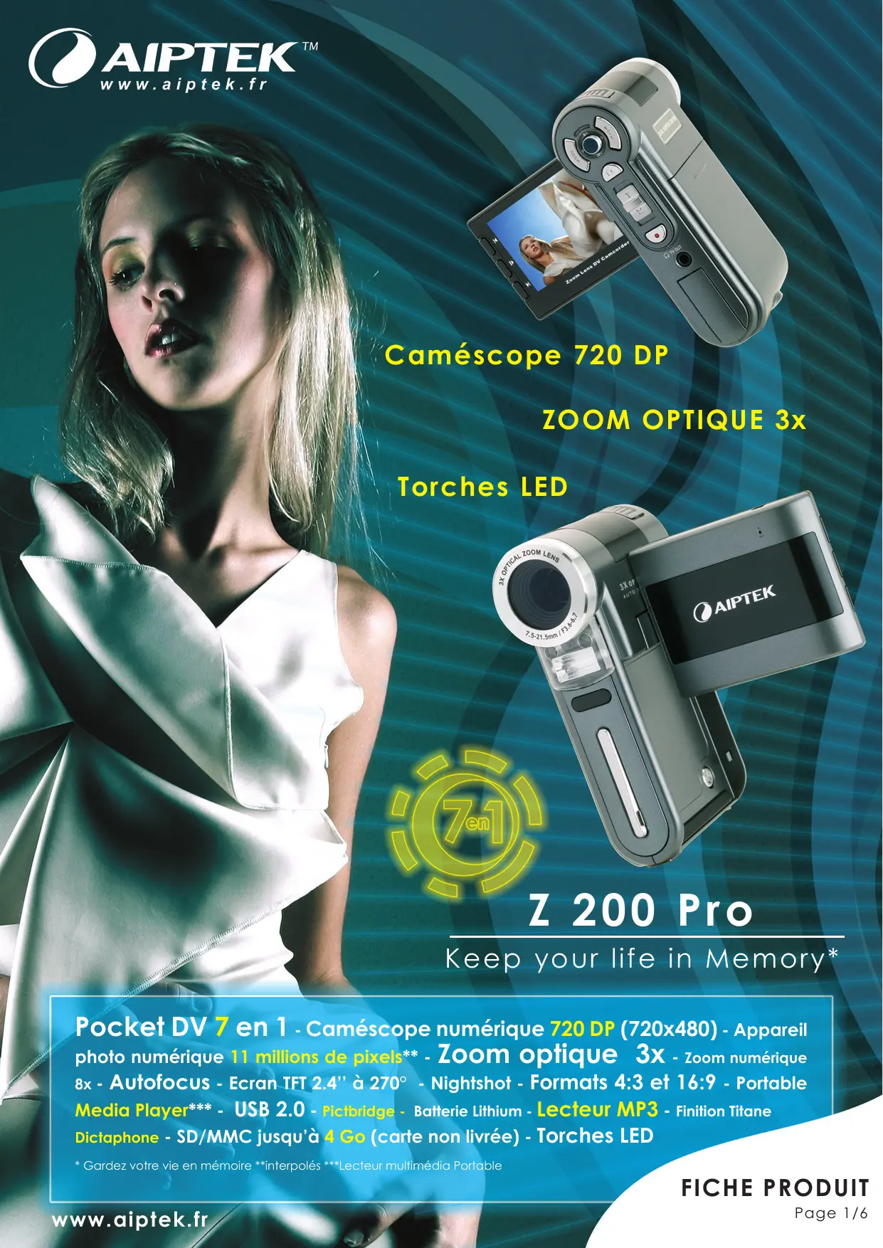 Présentation 1/ Caméscope numérique 720 DP / Torches LED intégrées Avec le nouveau Pocket DV Z200 Pro, retrouvez tout le meilleur d’Aiptek et de la technologie : un caméscope numérique 7 en 1 avec une résolution de 720 dp (720x480) au format MPEG-4. Les torches LED intégrées vous permettront de filmer jusqu’au bout de la nuit !