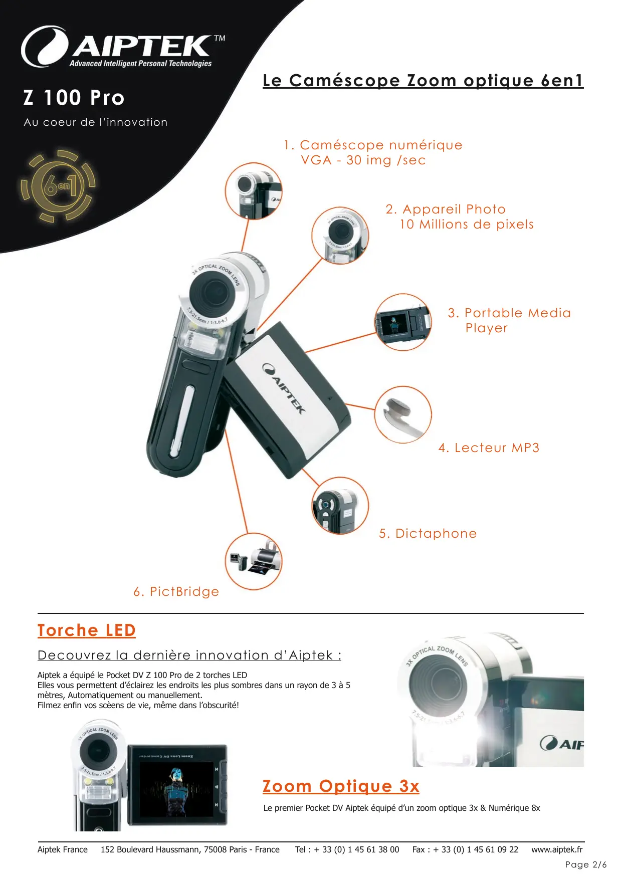 - résolution réglée sur VGA (640x480 pixels) Note : Ce tableau n’est là que pour référence. L’autonomie batterie réelle dépend de votre type de batterie et de son niveau de charge. Aiptek France 152 Boulevard Haussmann, 75008 Paris - France Tel : + 33 (0) 1 45 61 38 00 Fax : + 33 (0) 1 45 61 09 22 www.aiptek.fr Page 5/6 Z 100 Pro Au coeur de l’innovation Accessoires & Logistique Connectiques : Sortie USB Sortie direct TV (supporte NTSC/PAL) Sortie prise jack pour fonction MP3 Accessoires : Batterie 8210 LI- ION (3,7 V 850 mAh) Trépied / Ecouteurs stéréo Housse de transport & Dragonne Cable USB / Câble TV CD-Rom / Manuel multilingues européennes Logiciels : Plus créatifs, plus performants, plus innovants : Complets pour toutes vos activités numériques, ces softwares permettent - d’effectuez facilement des montages créatifs - de convertir vos fichiers, photo, vidéo et audio en format optimal - de traiter vos dossiers photos automatiquement sans les transférer ni les endommager DV Z100 pro Manager Muvee AutoProducer Arc Soft Media Card Companion / Photo / Media convertor Compatibilité : Windows 98SE / ME / 2000 / XP Logiciels d’application Caractéristiques logistiques : Code EAN : 4719851872808 Poids boite : Kg, Dimension boite : cm Poids carton : Kg, Dimension carton : cm Colisage : 20 Pces par carton Hotline +49 2154923555 - Email : support@aiptek.de Garantie : Europe 24 mois Aiptek France 152 Boulevard Haussmann, 75008 Paris - France Tel : + 33 (0) 1 45 61 38 00 Fax : + 33 (0) 1 45 61 09 22 www.aiptek.fr Page 6/6