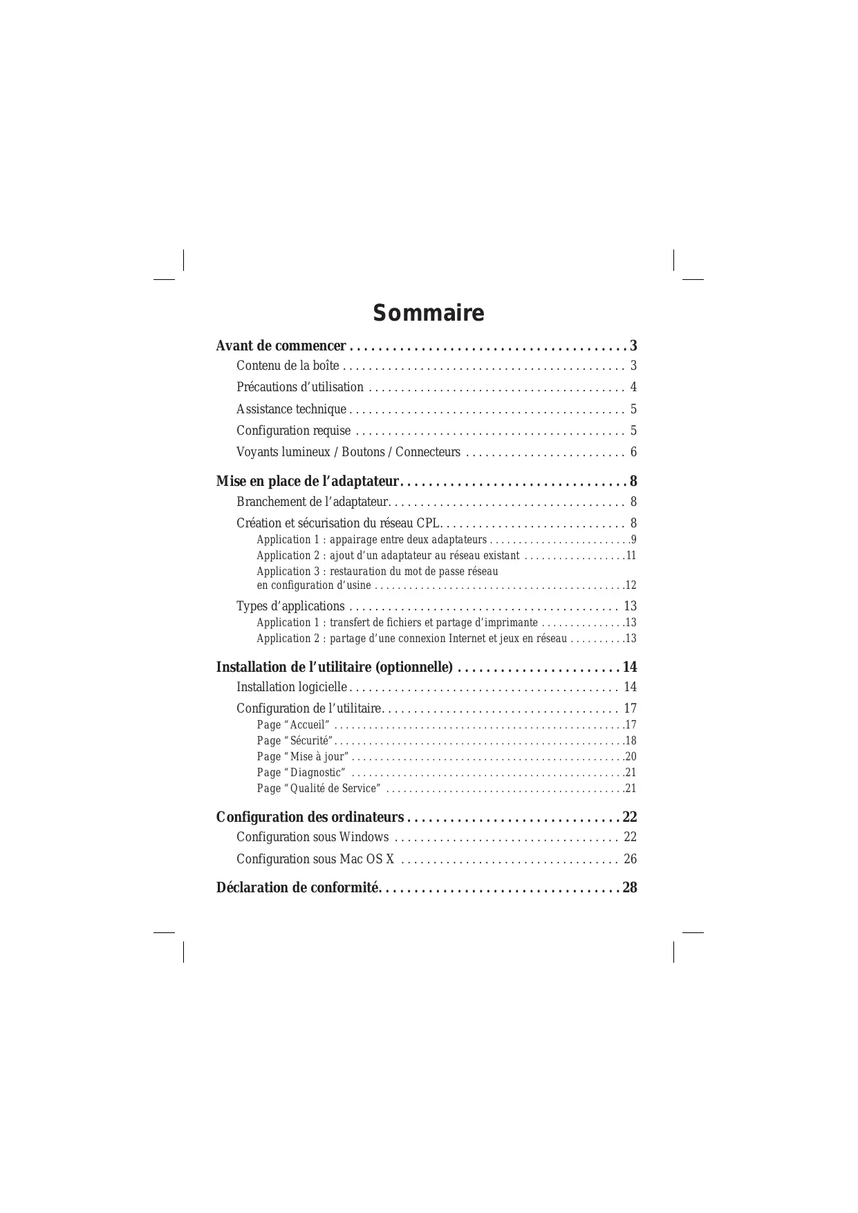 est éteint, la liaison avec Guide de l’utilisateur Types d’applications Application 1 : transfert de fichiers et partage d’imprimante Ci-dessous un exemple de connexion de deux ordinateurs sur un réseau et le partage d’une imprimante grâce à deux adaptateurs. Dans ce type de configuration, sans serveur DHCP disponible sur le réseau CPL, pour que les ordinateurs se connectent, une adresse IP fixe différente doit être attribuée à chacun d’entre eux. Application 2 : partage d’une connexion Internet et jeux en réseau L’adaptateur peut aussi vous permettre de profiter d’Internet et des jeux en réseau. Si votre carte réseau est correctement configurée (adresse IP fixe ou dynamique, passerelle avec l’adresse IP du routeur), l’ordinateur est immédiatement reconnu et prêt à recevoir des e-mails, surfer sur Internet, télécharger des fichiers et partager des dossiers avec d’autres ordinateurs sur le réseau. Guide de l’utilisateur
