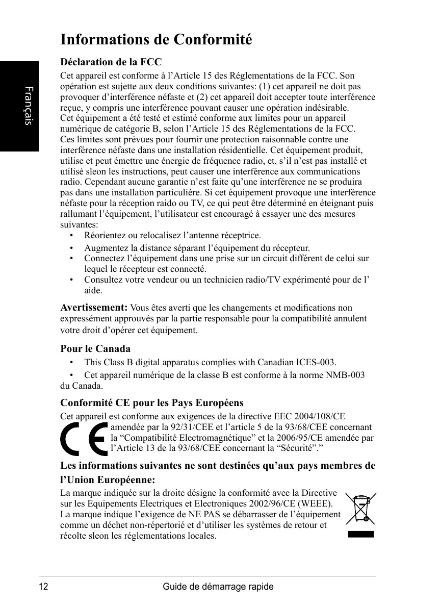 + This Class B digital apparatus complies with Canadian ICES-003. + Cet appareil numérique de la classe B est conforme à la norme NMB-003 du Canada. Conformité CE pour les Pays Européens Cet appareil est conforme aux exigences de la directive EEC 2004/108/CE amendée par la 92/31/CEE et l’article 5 de la 93/68/CEE concernant la “Compatibilité Electromagnétique” et la 2006/95/CE amendée par l'Article 13 de la 93/68/CEE concernant la “Sécurité”.” Les informations suivantes ne sont destinées qu’aux pays membres de