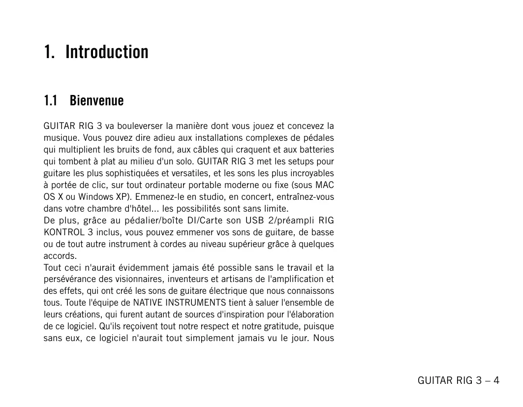 Ce manuel a été rédigé de façon à être le plus clair et concis possible. GUITAR RIG est aussi intuitif que les setups (amplis/effects) que vous pouvez connaître, mais sa véritable force réside dans sa flexibilité - les possibilités d'utilisation de GUITAR RIG sont bien plus nombreuses que celles des installations matérielles. Afin de profiter au moyen du potentiel de GUITAR RIG, nous vous conseillons de garder ce manuel à portée de main ; il vous éclairera sur les possibilités de GUITAR RIG, et vous inspirera peut-être des expériences sonores auxquelles vous n'auriez pas pensé. Le manuel est composé de deux parties principales. La première vous fournira un rapide aperçu du logiciel et du matériel, afin de vousmettre le pied à l'étrier le plus rapidement possible. La suite du manuel reférence tous les BOUTONS, POTENTIOMÉTRES et INTERRUPTEURS de l'interface. Si vous voulez améliorer votre utilisation de GUITAR RIG, et approfondir ses possibilités de design sonore, cette description exhaustive vous sera particulièrement utile.