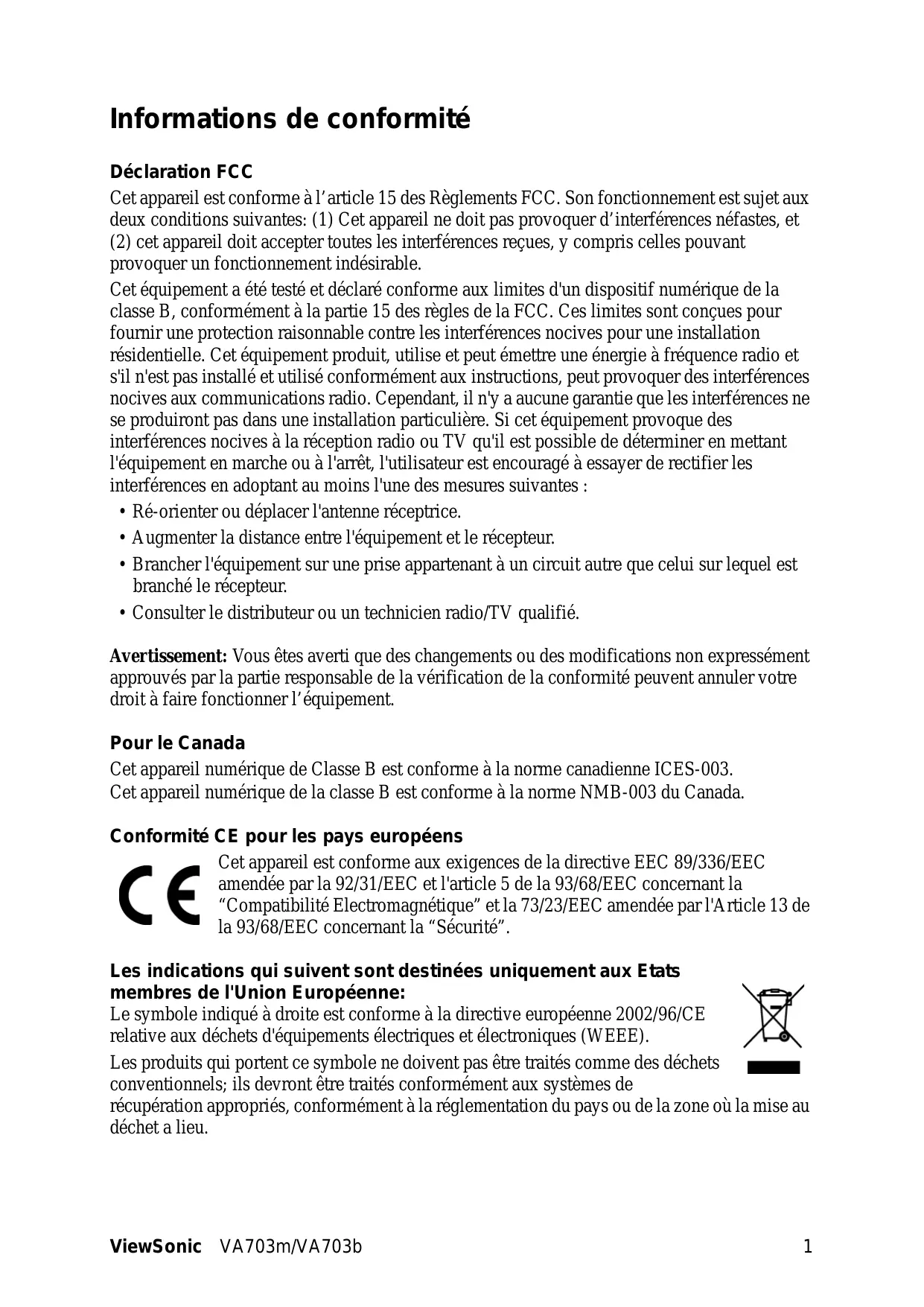 approuvés par la partie responsable de la vérification de la conformité peuvent annuler votre droit à faire fonctionner l’équipement. Pour le Canada Cet appareil numérique de Classe B est conforme à la norme canadienne ICES-003. Cet appareil numérique de la classe B est conforme à la norme NMB-003 du Canada. Conformité CE pour les pays européens Cet appareil est conforme aux exigences de la directive EEC 89/336/EEC amendée par la 92/31/EEC et l'article 5 de la 93/68/EEC concernant la “Compatibilité Electromagnétique” et la 73/23/EEC amendée par l'Article 13 de la 93/68/EEC concernant la “Sécurité”. Les indications qui suivent sont destinées uniquement aux Etats membres de l'Union Européenne: Le symbole indiqué à droite est conforme à la directive européenne 2002/96/CE relative aux déchets d'équipements électriques et électroniques (WEEE). Les produits qui portent ce symbole ne doivent pas être traités comme des déchets conventionnels; ils devront être traités conformément aux systèmes de récupération appropriés, conformément à la réglementation du pays ou de la zone où la mise au déchet a lieu. ViewSonic VA703m/VA703b