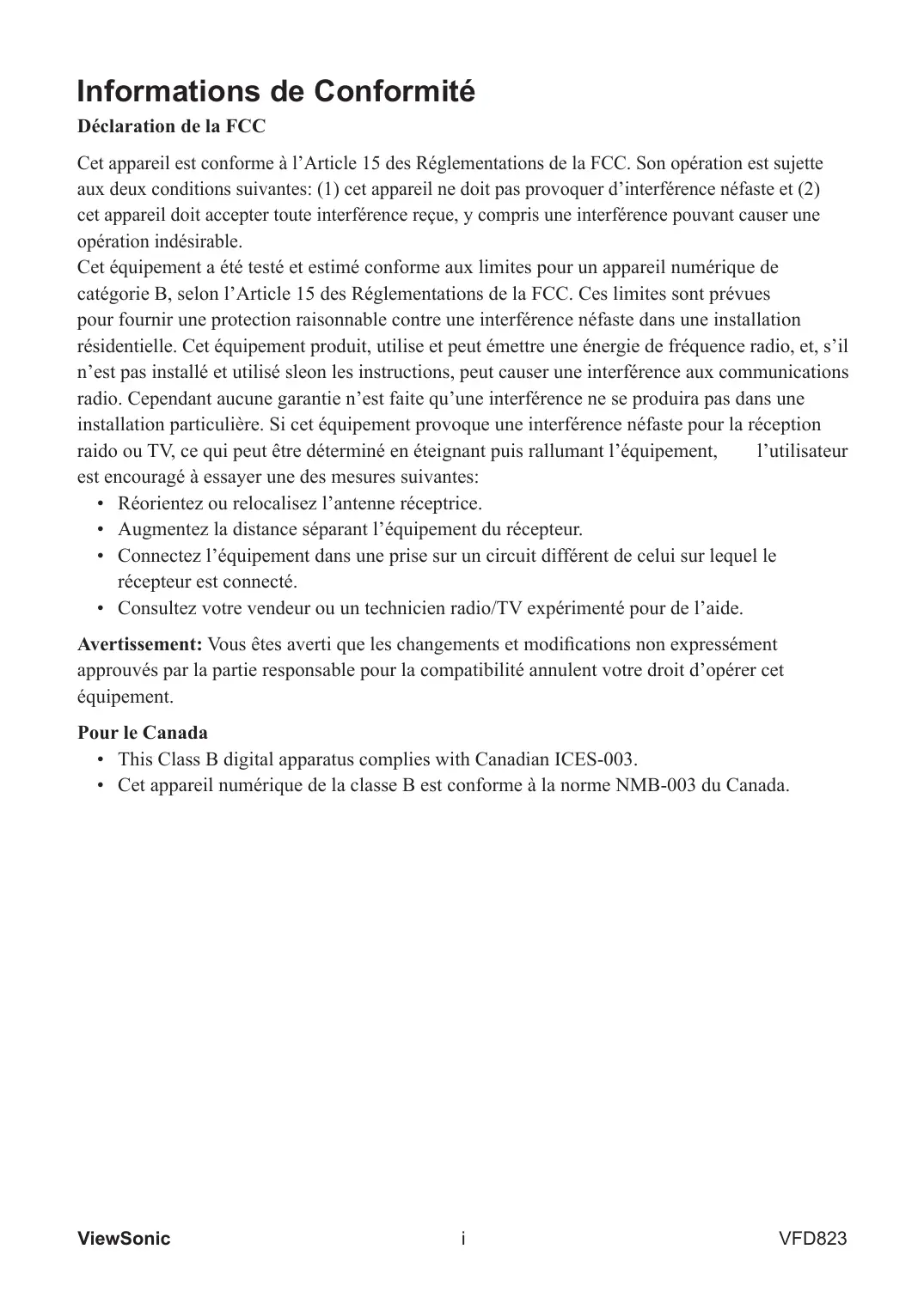 - Cet appareil numérique de la classe B est conforme à la norme NMB-003 du Canada. ViewSonic