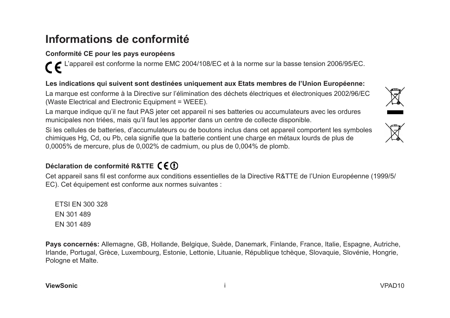 L’appareil est conforme la norme EMC 2004/108/EC et à la norme sur la basse tension 2006/95/EC. Les indications qui suivent sont destinées uniquement aux Etats membres de l’Union Européenne: La marque est conforme à la Directive sur l’élimination des déchets électriques et électroniques 2002/96/EC (Waste Electrical and Electronic Equipment = WEEE). La marque indique qu’il ne faut PAS jeter cet appareil ni ses batteries ou accumulateurs avec les ordures municipales non triées, mais qu’il faut les apporter dans un centre de collecte disponible. Si les cellules de batteries, d’accumulateurs ou de boutons inclus dans cet appareil comportent les symboles chimiques Hg, Cd, ou Pb, cela signifie que la batterie contient une charge en métaux lourds de plus de 0,0005% de mercure, plus de 0,002% de cadmium, ou plus de 0,004% de plomb. Déclaration de conformité R&TTE Cet appareil sans fil est conforme aux conditions essentielles de la Directive R&TTE de l’Union Européenne (1999/5/ EC). Cet équipement est conforme aux normes suivantes : ETSI EN 300 328 EN 301 489 EN 301 489 Pays concernés: Allemagne, GB, Hollande, Belgique, Suède, Danemark, Finlande, France, Italie, Espagne, Autriche, Irlande, Portugal, Grèce, Luxembourg, Estonie, Lettonie, Lituanie, République tchèque, Slovaquie, Slovénie, Hongrie, Pologne et Malte. ViewSonic 3. Ne pas placer le PC tablette sur la surface de travail instable ou inégale. 4. Ne pas placer ou déposer des objets au dessus du PC tablette. Ne pas faire glisser d’objets étrangers dans le PC tablette. Ne pas secouer l’écran LCD trop fort. 5. NE PAS exposer le PC tablette aux champs magnétiques ou électriques, ne pas placer la disquette de près ou sur le PC tablette, les données de la disquette risquent de se perdre. 6. Ne pas laissez le PC tablette sous le soleil, car il peut endommager l’écran à cristaux liquides, en particulier dans la voiture. 7. TEMP de Sécurité: ce PC tablette devrait être utilisé dans des environnements avec des températures ambiantes comprises entre 5 ° C (41 ° F) et 35 ° C (95 ° F). 8. NE PAS exposer le PC tablette ou l’utiliser près de liquides, la pluie ou l’humidité. 9. Attention: il risque d’exploser si la batterie est remplacée par un type incorrect. Débarrassez-vous des batteries usagées conformément aux instructions. 10. Ne jetez pas le PC tablette dans les déchets municipaux. Vérifiez les règlements locaux pour l’élimination de produits électroniques. Faire recyclage de la batterie et vérifier auprès de votre autorité locale ou le détaillant pour des conseils. 11. Le PC tablette et l’adaptateur peut se produisent de la chaleur au cours d’exploitation ou de la charge. NE PAS laisser le PC tablette sur vos genoux ou de toute partie du corps afin d’éviter l’inconfort ou de blessure de l’exposition à la chaleur.