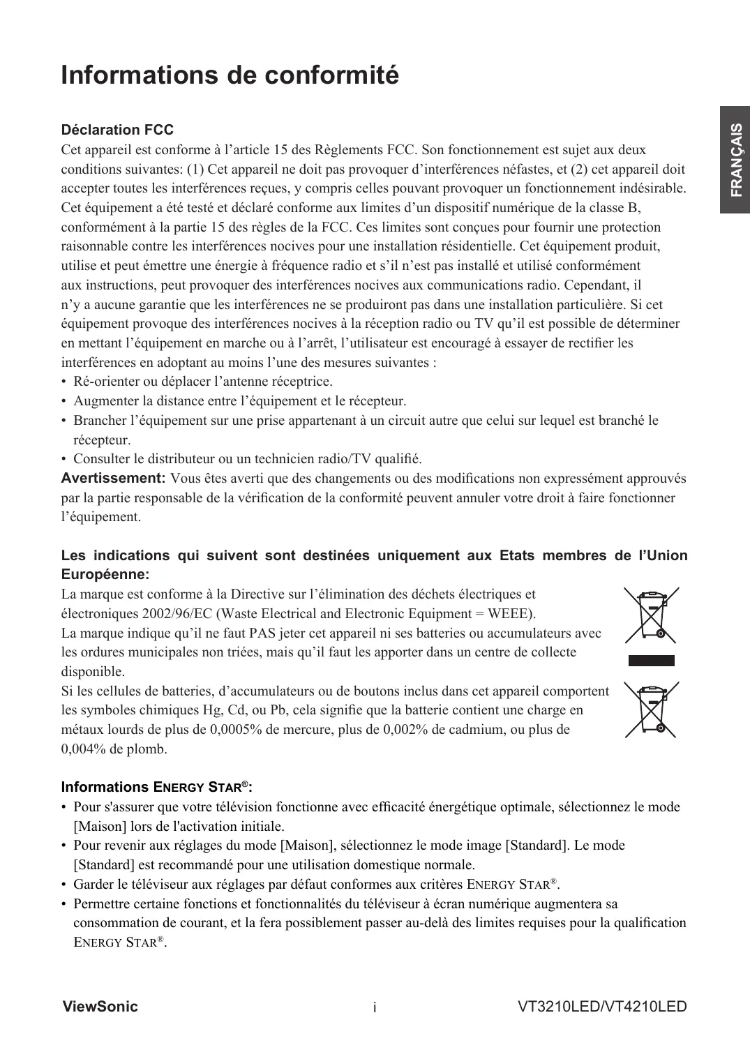 Nom commercial : Modèle ViewSonic : VT3210LED / VT4210LED Partie responsable : ViewSonic Corporation • Augmentez la distance entre l’appareil et le récepteur. • Branchez l’appareil dans une prise de courant sur un circuit différent de celui auquel le récepteur est branché. • Consultez le revendeur ou un technicien radio/télévision expérimenté pour de l’aide. Conformément à la réglementation FCC,soyez conscient du fait que tout changement ou modification non expressément approuvé dans ce manuel annulera votre droit à utiliser cet appareil.