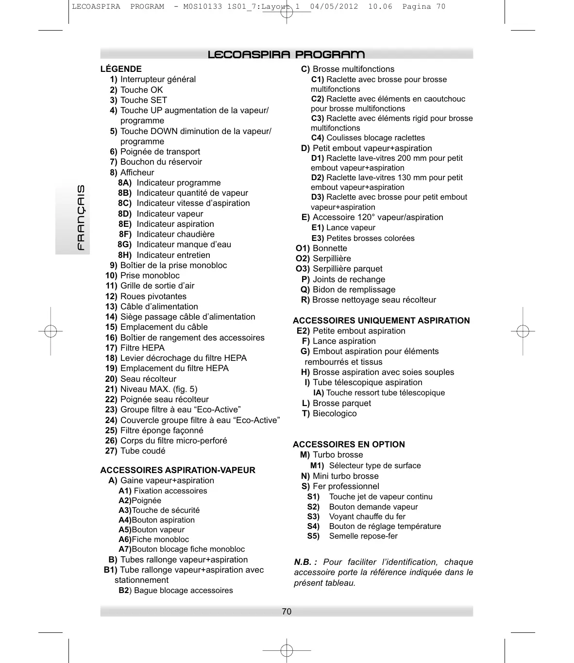 FRANÇAIS ACCESSOIRES A UTILISER : accessoire 120 ° (E) avec accessoire, comme indiqué dans le tableau suivant : LECOASPIRA PROGRAM - M0S10133 1S01_7:Layout 1 04/05/2012