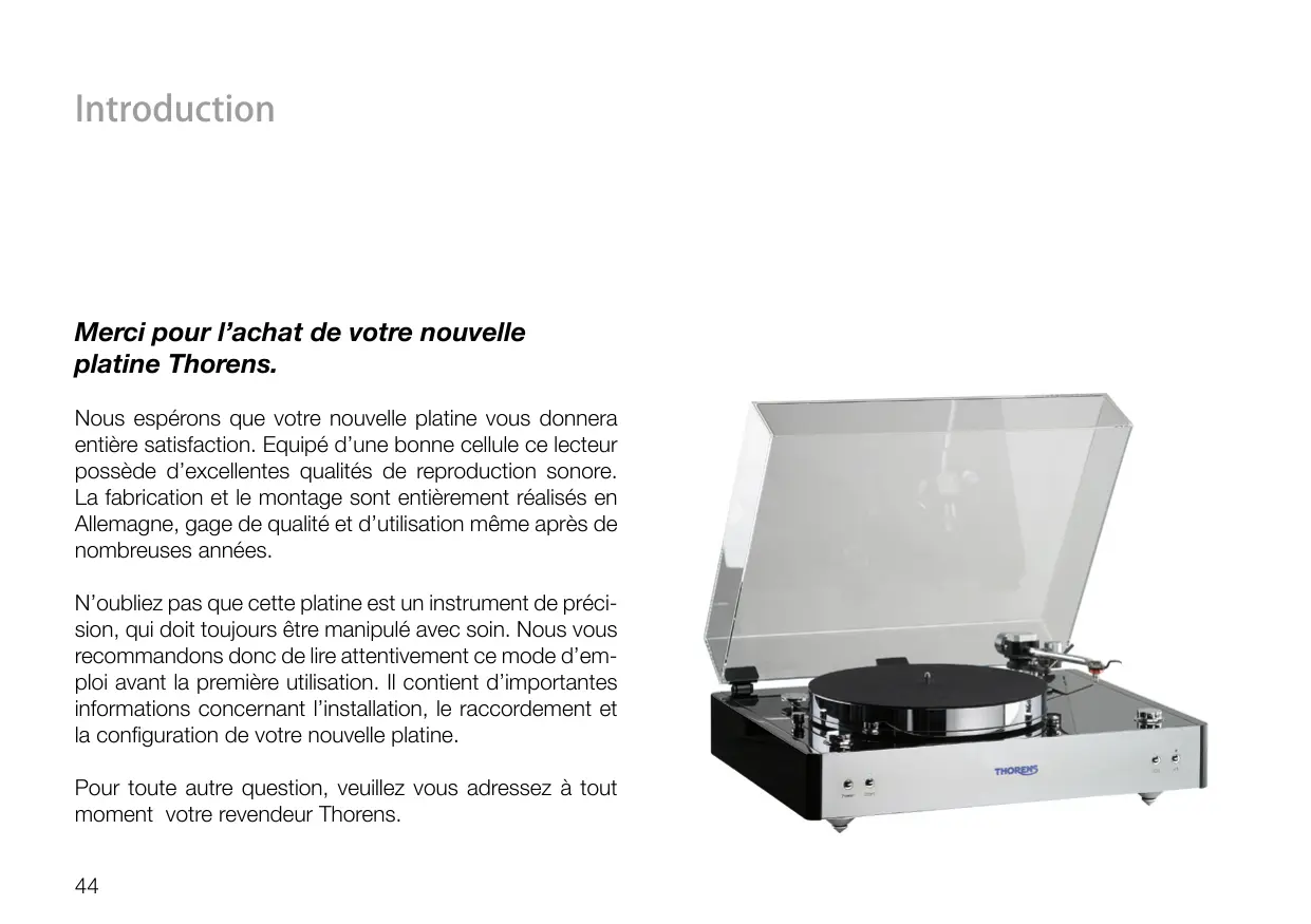 Introduction Merci pour l’achat de votre nouvelle platine Thorens. Nous espérons que votre nouvelle platine vous donnera entière satisfaction. Equipé d’une bonne cellule ce lecteur possède d’excellentes qualités de reproduction sonore. La fabrication et le montage sont entièrement réalisés en Allemagne, gage de qualité et d’utilisation même après de nombreuses années. N’oubliez pas que cette platine est un instrument de précision, qui doit toujours être manipulé avec soin. Nous vous recommandons donc de lire attentivement ce mode d’emploi avant la première utilisation. Il contient d’importantes informations concernant l’installation, le raccordement et la configuration de votre nouvelle platine. Pour toute autre question, veuillez vous adressez à tout moment votre revendeur Thorens.