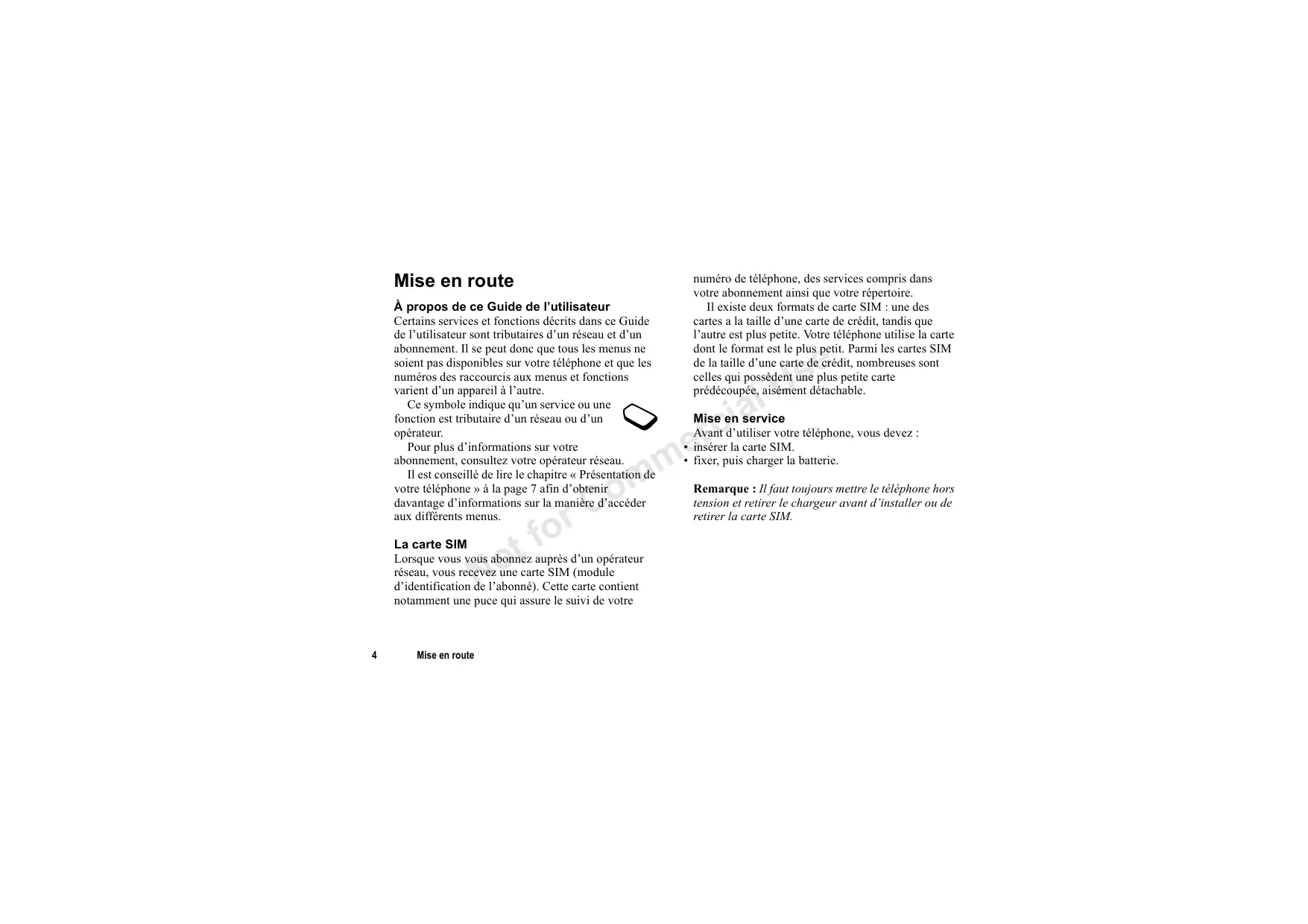 Vous devez insérer la carte SIM et charger la batterie pour pouvoir utiliser le téléphone.