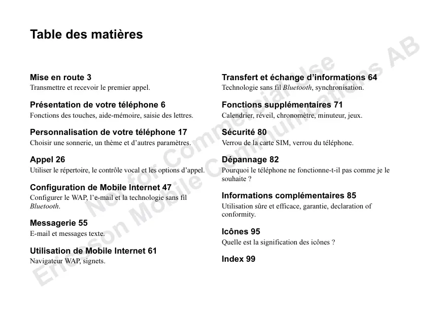 Ericsson Mobile Communications AB peut procéder en tout temps et sans préavis à toute amélioration et à toute modification à la suite d'une erreur typographique, d'une erreur dans l'information représentée ou de toute amélioration apportée aux programmes et/ou au matériel. De telles modifications seront toutes intégrées aux nouvelles éditions de ce manuel.