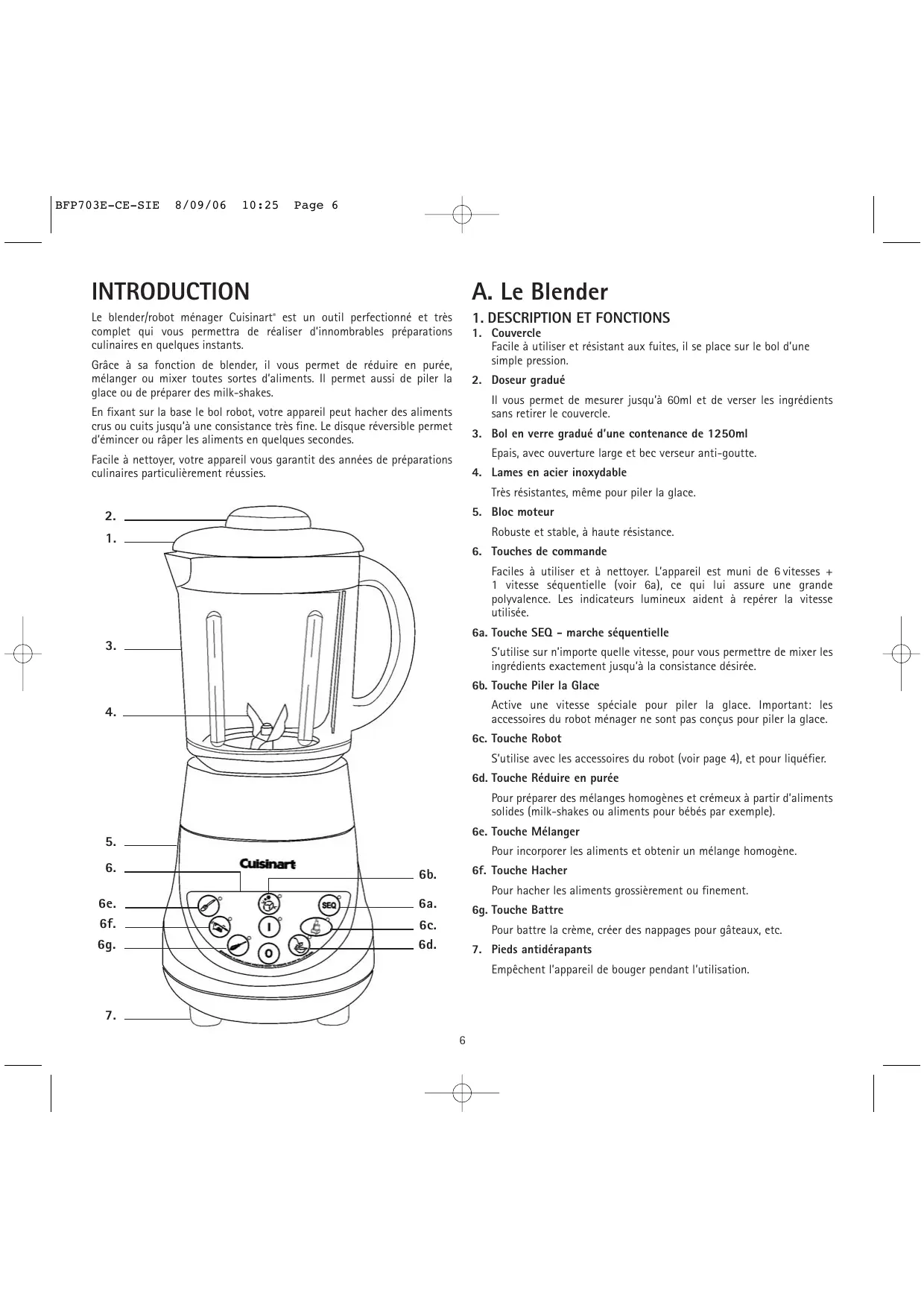 BFP703E-CE-SIE 8/09/06 10:25 Page 6 INTRODUCTION A. Le Blender Le blender/robot ménager Cuisinart® est un outil perfectionné et très complet qui vous permettra de réaliser d’innombrables préparations culinaires en quelques instants.