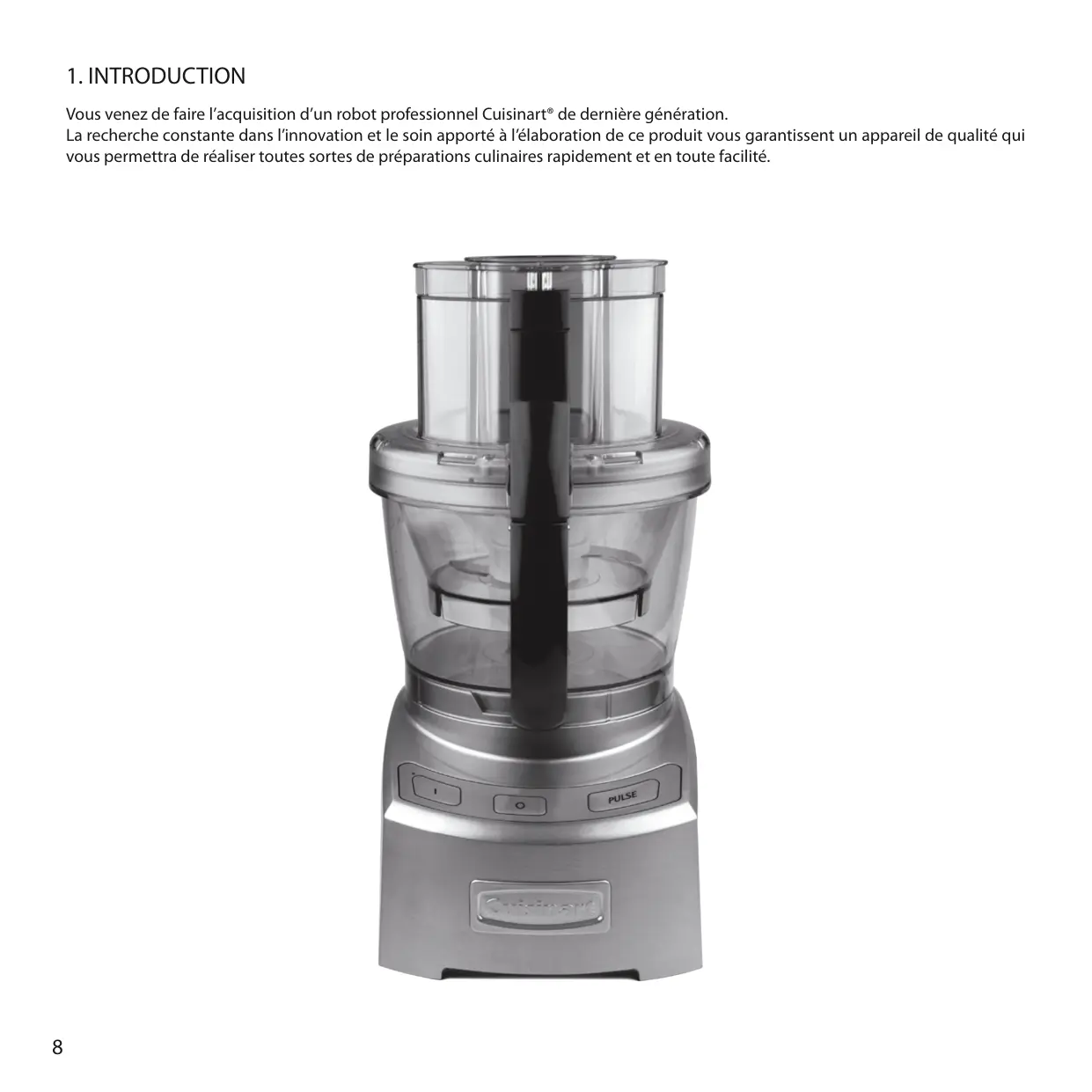 Vous venez de faire l'acquisition d'un robot professionnel Cuisinart® de dernière génération. La recherche constante dans l'innovation et le soin apporté à l'élaboration de ce produit vous garantissent un appareil de qualité qui vous permettra de réaliser toutes sortes de préparations culinaires rapidement et en toute facilité.