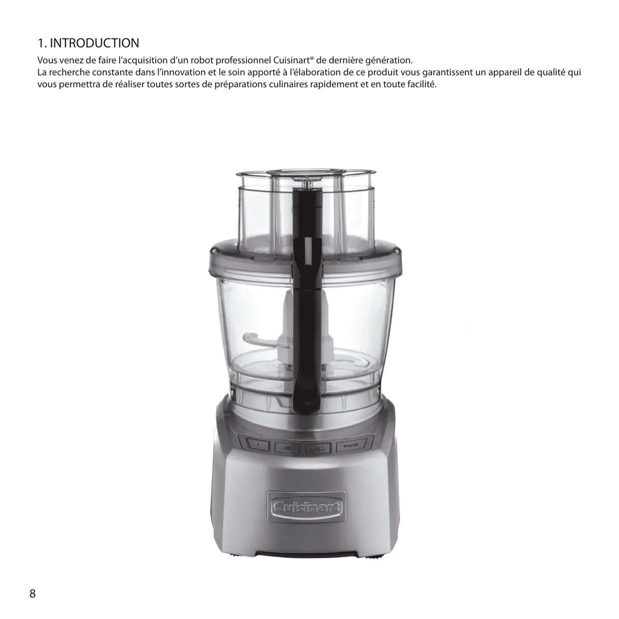 Vous venez de faire l’acquisition d’un robot professionnel Cuisinart® de dernière génération. La recherche constante dans l’innovation et le soin apporté à l’élaboration de ce produit vous garantissent un appareil de qualité qui vous permettra de réaliser toutes sortes de préparations culinaires rapidement et en toute facilité.