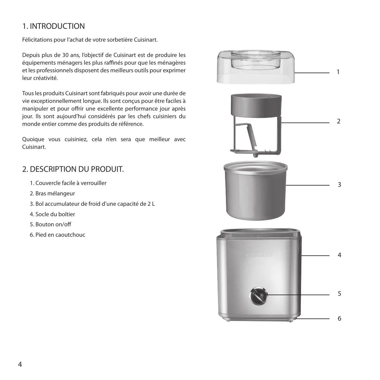 Félicitations pour l’achat de votre sorbetière Cuisinart. Depuis plus de 30 ans, l’objectif de Cuisinart est de produire les équipements ménagers les plus raffinés pour que les ménagères et les professionnels disposent des meilleurs outils pour exprimer leur créativité. Tous les produits Cuisinart sont fabriqués pour avoir une durée de vie exceptionnellement longue. Ils sont conçus pour être faciles à manipuler et pour offrir une excellente performance jour après jour. Ils sont aujourd’hui considérés par les chefs cuisiniers du monde entier comme des produits de référence.