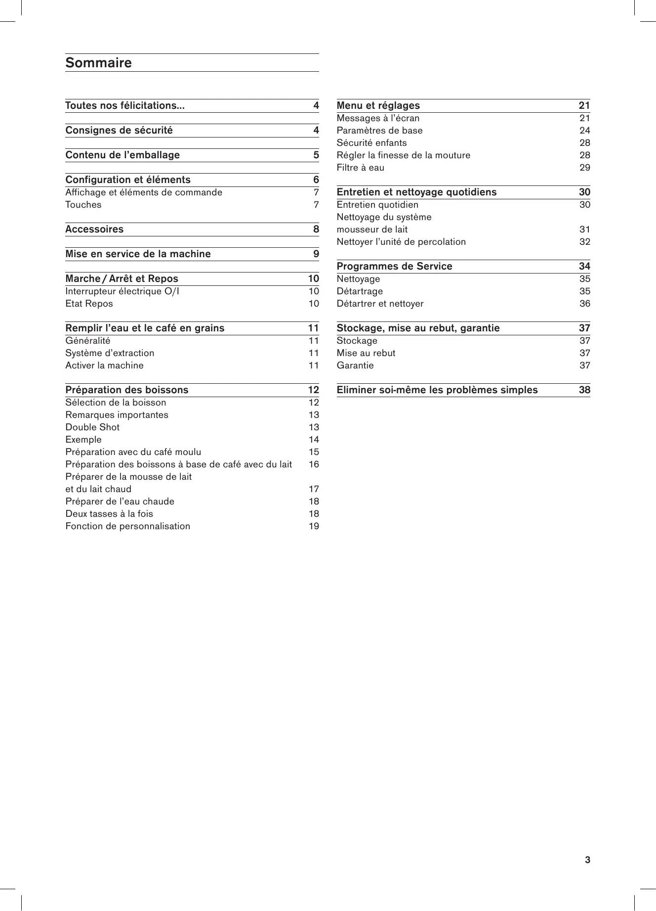 Toutes nos félicitations... $$ Consignes de sécurité ...pour l’achat de ce produit. En optant pour cette machine à café entièrement automatique, vous avez fait l’acquisition d’un appareil moderne ; il associe une technique innovante, une large variété de fonctions et un grand confort de commande. Avant d’utiliser la machine, lisez attentivement le Mode d’emploi, conformez-vous à ses indications et conservez-le en lieu sûr. Tenez compte aussi du Mémento fourni. Vous pouvez ainsi, très facilement et rapidement, préparer différentes boissons chaudes – qu’il s’agisse d’une tasse de café traditionnel, de caffè latte digeste, de latte macchiato, d’un cappuccino bien crémeux ou d’un espresso au goût corsé. En même temps, l’appareil offre de nombreuses possibilités pour s’adapter à votre goût personnel. Afin que vous puissiez utiliser de manière fiable et sûre la machine à café avec ses possibilités et fonctions, familiarisez-vous avec ses différentes parties, ses fonctions, affichages et éléments de commande. Ce mode d’emploi devrait vous y aider. Pour cela, prenez le temps nécessaire et lisez-le avant de mettre la machine en service. Il est joint à la machine un Mémento où vous retrouverez rapidement les fonctions essentielles. Vous pouvez le ranger dans le logement situé à droite, à l’extérieur de la machine. Cette machine Espresso tout automatique est conçue pour la préparation de quantités usuelles, dans le cadre d’un foyer ou d’un usage non-commercial de type domestique. Citons par ex. les cuisines du personnel dans les com merces, bureaux, exploitations agricoles et établissements artisanaux ainsi que les clients de pensions, petits hôtels et toute autre résidence de type similaire. La machine doit être alimentée exclusivement en eau froide. N’utiliser que les produits indiqués dans le mode d’emploi (café, produit nettoyant/détartrant). N’utiliser la machine qu’à l’intérieur et à température ambiante. Ne pas confier l’appareil à des personnes (y compris des enfants) aux capacités sensorielles ou intellectuelles diminuées ou ne disposant pas d’une expérience ou d’une connaissance suffisante, sauf si elles le font sous surveillance ou si elles ont bénéficié préalablement d’une information à propos de la manipulation de l’appareil de la part de la personne responsable de leur sécurité. Tenir les enfants éloignés de la machine. Surveiller les enfants afin de les empêcher de jouer avec la machine. $$ Risque de choc électrique ! Pour le raccordement et l’utilisation de la machine, respecter impérativement les indications figurant sur la plaque signalétique. N’utiliser la machine que si le cordon électrique et la machine ne présentent aucun dommage. En cas de défaut, actionner immédiatement l’interrupteur pour isoler la machine du réseau. Puis, débrancher le cordon électrique. Ne pas ouvrir ou démonter la machine. Ne jamais plonger le cordon électrique dans l’eau. Les réparations sur la machine, par ex. le remplacement du cordon électrique, doivent être effectuées uniquement par notre Service Clientèle afin d’éliminer tous les risques. $$ Risque de blessure ! Ne pas glisser les doigts à l’intérieur du moulin. $$ Risque de brûlure ! La buse du mousseur Eau chaude / Vapeur devient brûlante. Après utilisation, bien laisser refroidir avant de la saisir. $$ Risque de blessure ! Insérer et retirer la machine avec précaution du meuble où elle est intégrée afin de ne pas coincer les doigts.