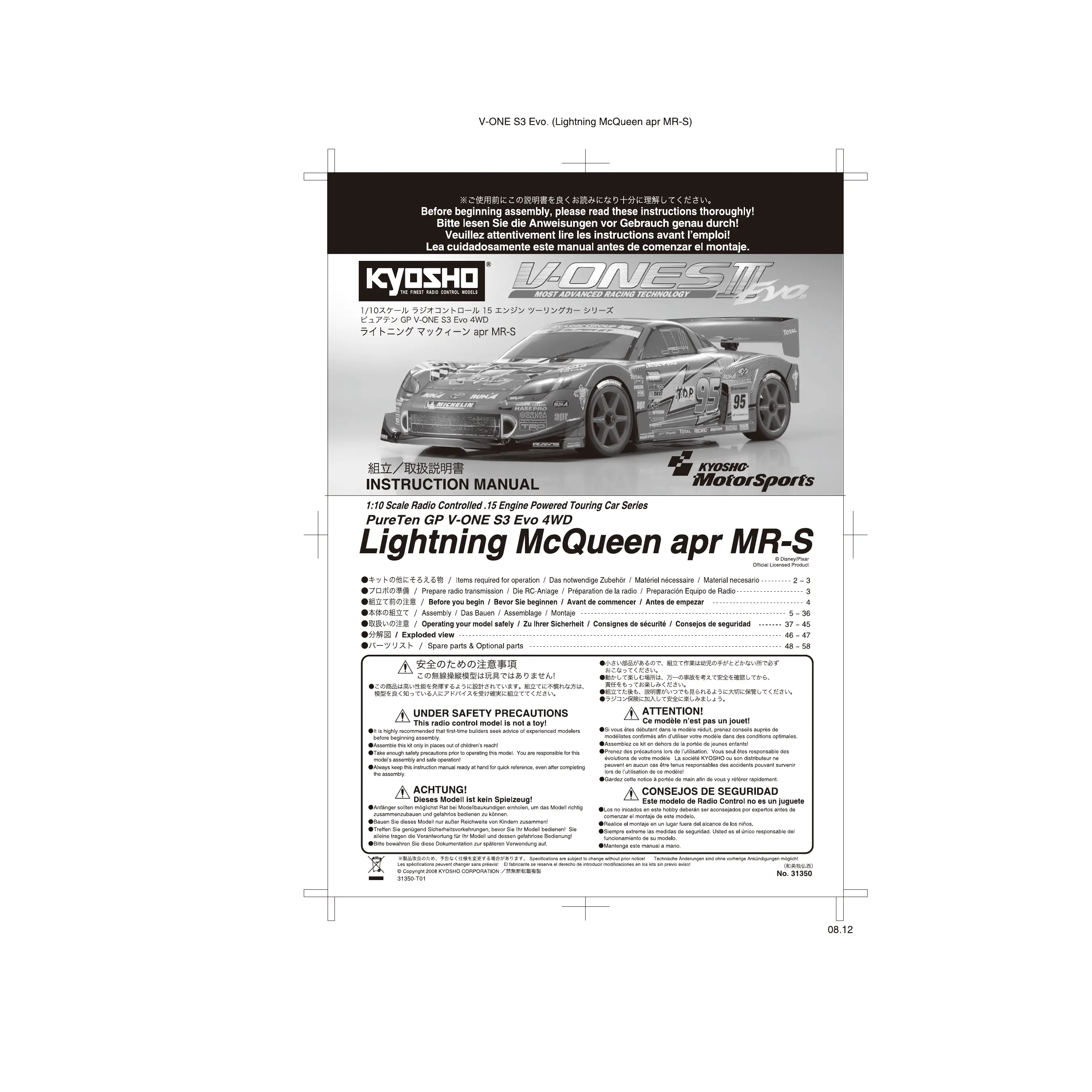 V-ONE SIII EVO LIGHTNING MCQUEEN APR MR-S - Modèle réduit de voiture télécommandée KYOSHO - Notice d'utilisation et mode d'emploi gratuit