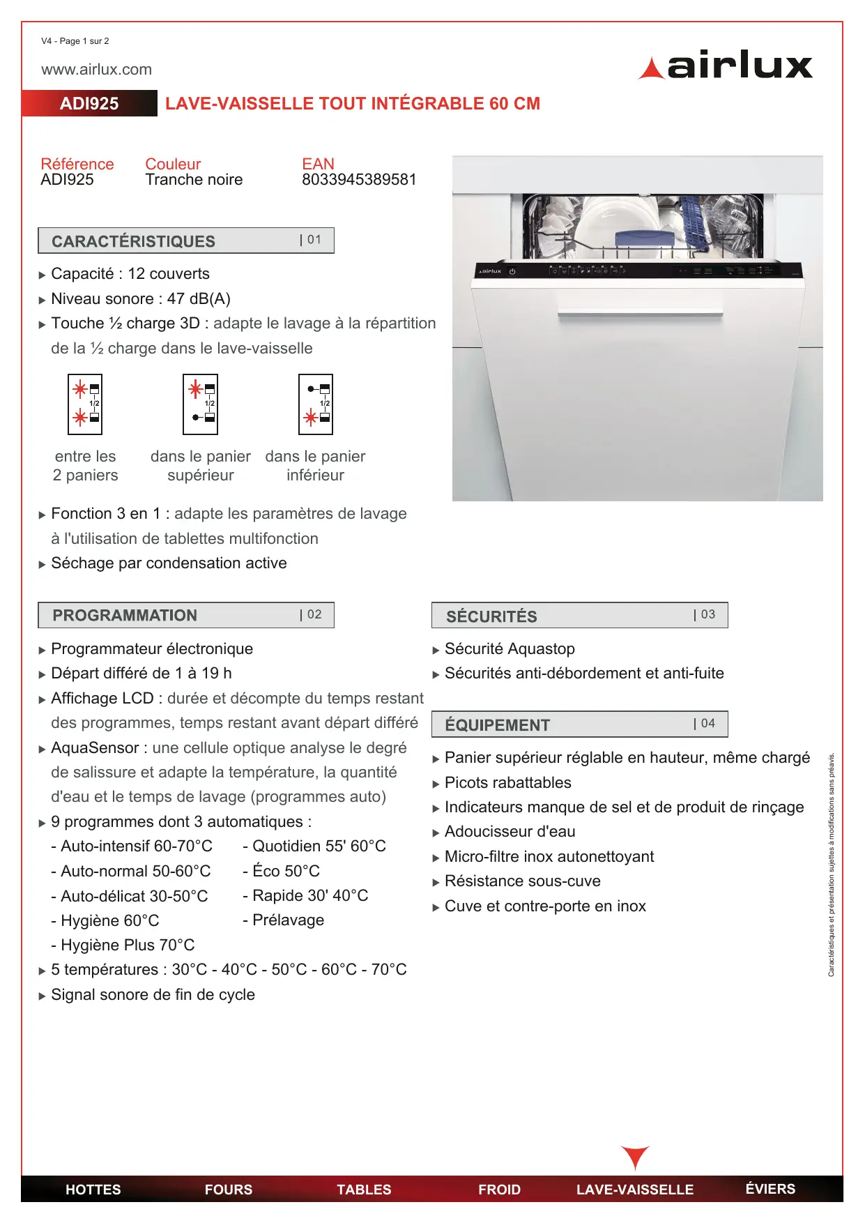 ADI925 - Lave-vaisselle AIRLUX - Notice d'utilisation et mode d'emploi gratuit