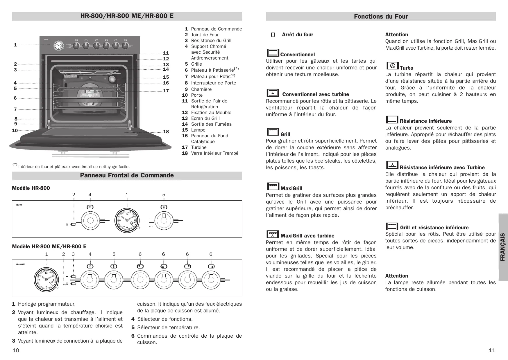 Panneau de Commande Joint de Four Résistance du Grill Support Chromé avec Securité Antirenversement Grille Plateau à Patisserie(*) Plateau pour Rôtis(*) Interrupteur de Porte Charnière Porte Sortie de l’air de Réfrigération Fixation au Meuble Ecran du Grill Sortie des Fumées Lampe Panneau du Fond Catalytique Turbine Verre Intérieur Trempé Intérieur du four et plâteaux avec émail de nettoyage facile. Arrêt du four Conventionnel Utiliser pour les gâteaux et les tartes qui doivent recevoir une chaleur uniforme et pour obtenir une texture moelleuse. Conventionnel avec turbine Recommandé pour les rôtis et la pâtisserie. Le ventilateur répar tit la chaleur de façon uniforme á l’intérieur du four. Grill Pour gratiner et rôtir superficiellement. Permet de dorer la couche extérieure sans affecter l’intérieur de l’aliment. Indiqué pour les piéces plates telles que les beefsteaks, les côtelettes, les poissons, les toasts. Panneau Frontal de Commande Modèle HR-800