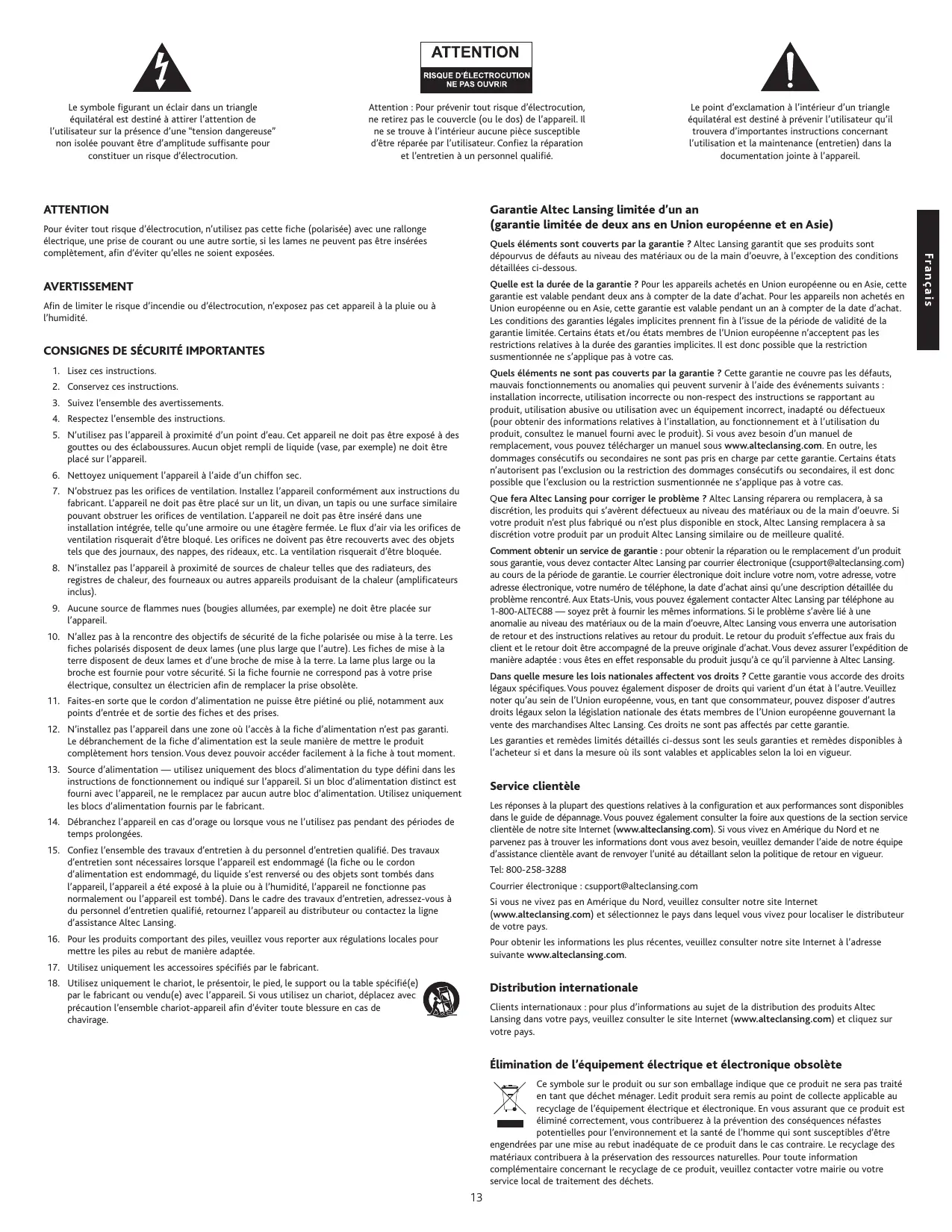 Le symbole figurant un éclair dans un triangle équilatéral est destiné à attirer l’attention de l’utilisateur sur la présence d’une “tension dangereuse” non isolée pouvant être d’amplitude suffisante pour constituer un risque d’électrocution. Attention : Pour prévenir tout risque d’électrocution, ne retirez pas le couvercle (ou le dos) de l’appareil. Il ne se trouve à l’intérieur aucune pièce susceptible d’être réparée par l’utilisateur. Confiez la réparation et l’entretien à un personnel qualifié. ATTENTION Le point d’exclamation à l’intérieur d’un triangle équilatéral est destiné à prévenir l’utilisateur qu’il trouvera d’importantes instructions concernant l’utilisation et la maintenance (entretien) dans la documentation jointe à l’appareil. Garantie Altec Lansing limitée d’un an (garantie limitée de deux ans en Union européenne et en Asie) Quels éléments sont couverts par la garantie ? Altec Lansing garantit que ses produits sont dépourvus de défauts au niveau des matériaux ou de la main d’oeuvre, à l’exception des conditions détaillées ci-dessous. Quelle est la durée de la garantie ? Pour les appareils achetés en Union européenne ou en Asie, cette garantie est valable pendant deux ans à compter de la date d’achat. Pour les appareils non achetés en Union européenne ou en Asie, cette garantie est valable pendant un an à compter de la date d’achat. Les conditions des garanties légales implicites prennent fin à l’issue de la période de validité de la garantie limitée. Certains états et/ou états membres de l’Union européenne n’acceptent pas les restrictions relatives à la durée des garanties implicites. Il est donc possible que la restriction susmentionnée ne s’applique pas à votre cas. AVERTISSEMENT Afin de limiter le risque d’incendie ou d’électrocution, n’exposez pas cet appareil à la pluie ou à l’humidité. Quels éléments ne sont pas couverts par la garantie ? Cette garantie ne couvre pas les défauts, mauvais fonctionnements ou anomalies qui peuvent survenir à l’aide des événements suivants : installation incorrecte, utilisation incorrecte ou non-respect des instructions se rapportant au produit, utilisation abusive ou utilisation avec un équipement incorrect, inadapté ou défectueux (pour obtenir des informations relatives à l’installation, au fonctionnement et à l’utilisation du produit, consultez le manuel fourni avec le produit). Si vous avez besoin d’un manuel de remplacement, vous pouvez télécharger un manuel sous www.alteclansing.com. En outre, les dommages consécutifs ou secondaires ne sont pas pris en charge par cette garantie. Certains états n’autorisent pas l’exclusion ou la restriction des dommages consécutifs ou secondaires, il est donc possible que l’exclusion ou la restriction susmentionnée ne s’applique pas à votre cas.