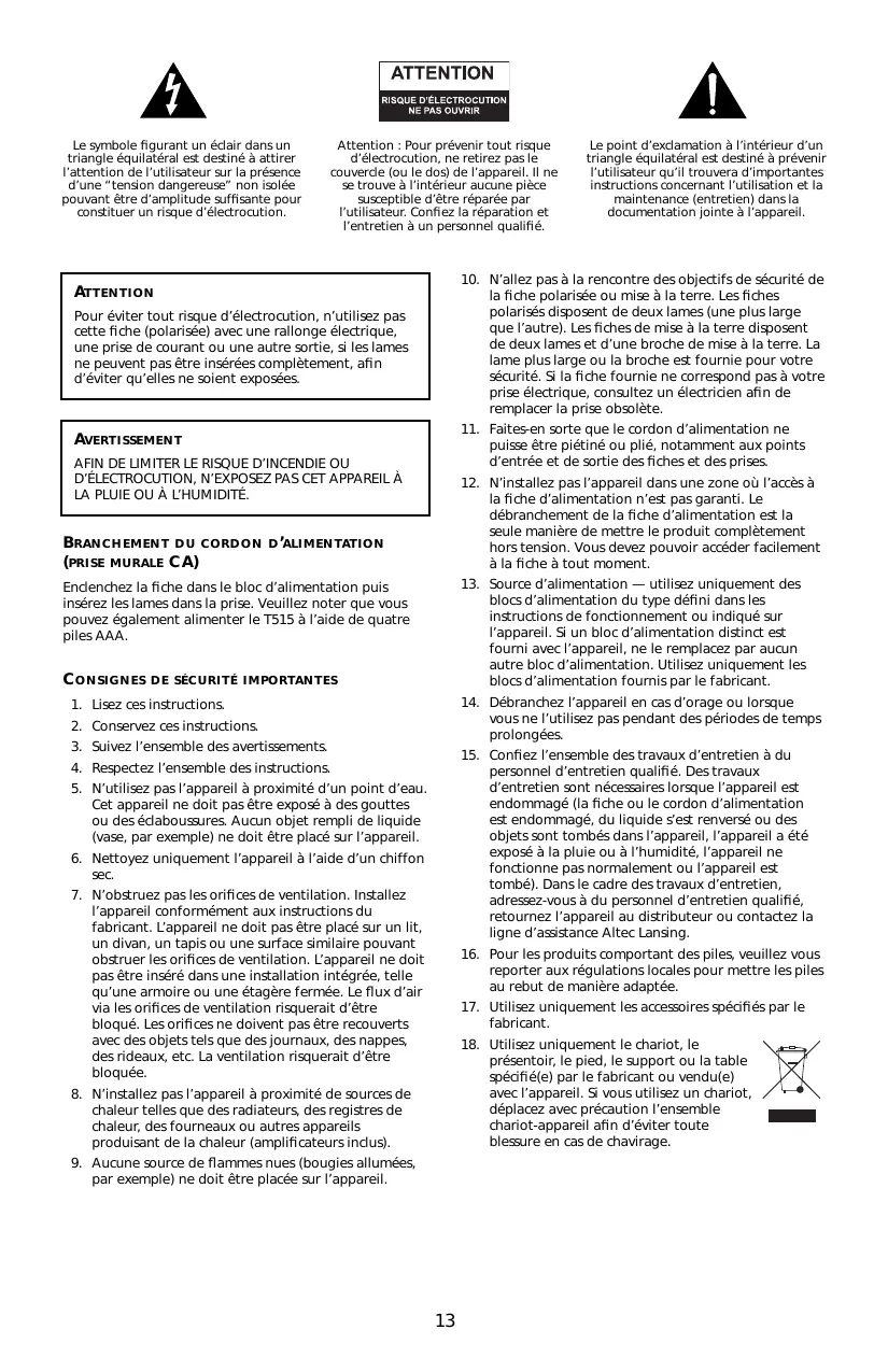 15. Confiez l’ensemble des travaux d’entretien à du personnel d’entretien qualifié. Des travaux d’entretien sont nécessaires lorsque l’appareil est endommagé (la fiche ou le cordon d’alimentation est endommagé, du liquide s’est renversé ou des objets sont tombés dans l’appareil, l’appareil a été exposé à la pluie ou à l’humidité, l’appareil ne fonctionne pas normalement ou l’appareil est tombé). Dans le cadre des travaux d’entretien, adressez-vous à du personnel d’entretien qualifié, retournez l’appareil au distributeur ou contactez la ligne d’assistance Altec Lansing.