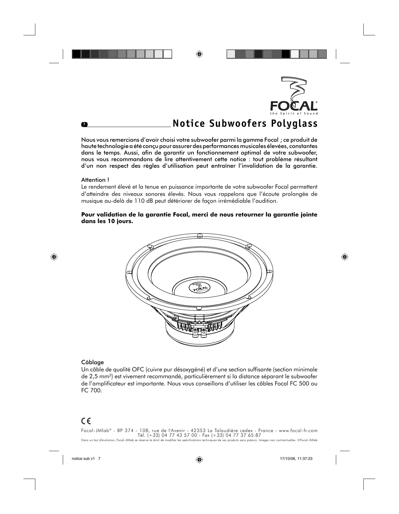 the Spirit of Sound @________________ Notice Subwoofers Polyglass Nous vous remercions d'avoir choisi votre subwoofer parmi la gamme Focal ; ce produit de haute technologie a été conçu pour assurer des performances musicales élevées, constantes dans le temps. Aussi, afin de garantir un fonctionnement optimal de votre subwoofer, nous vous recommandons de lire attentivement cette notice : tout problème résultant d’un non respect des règles d'utilisation peut entraîner l'invalidation de la garantie. Attention | Le rendement élevé et la tenue en puissance importante de votre subwoofer Focal permettent d'atteindre des niveaux sonores élevés. Nous vous rappelons que l'écoute prolongée de musique au-delà de 110 dB peut détériorer de façon irrémédiable l'audition. Pour validation de la garantie Focal, merci de nous retourner la garantie jointe dans les 10 jours. Cäblage Un cäble de qualité OFC {cuivre pur désoxygéné) et d’une section suffisante [section minimale de 2,5 mm) est vivement recommandé, particulièrement si la distance séparant le subwoofer de l'amplificateur est importante. Nous vous conseillons d'utiliser les câbles Focal FC 500 ou FC 700.