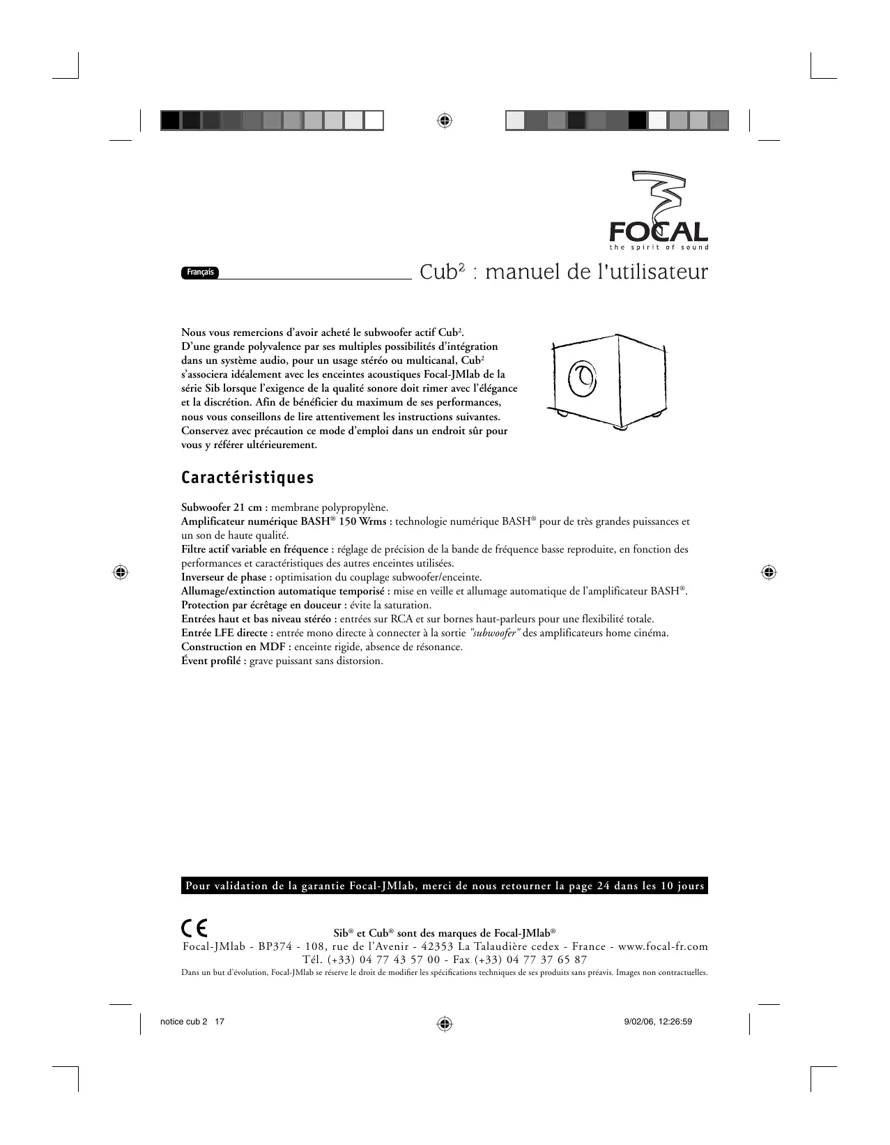 FOCAL the spirit of sound &Gn ____ Cub?: manuel de l'utilisateur Nous vous remercions d'avoir acheté Le subwoofer actif Cub?. D'une grande polyvalence par ses multiples possibilités d'intégration dans un système audio, pour un usage stéréo ou multicanal, Cub? s'associera idéalement avec les enceintes acoustiques Focal-JMlab de la « série Sib lorsque l'exigence de la qualité sonore doit rimer avec l'élégance et la discrétion. Afin de bénéficier du maximum de ses performances, nous vous conseillons de lire attentivement les instructions suivantes. Conservez avec précaution ce mode d'emploi dans un endroit sûr pour vous y référer ultérieurement. Caractéristiques Subwoofer 21 cm : membrane polypropylène. Amplificateur numérique BASH®° 150 Wrms : technologie numérique BASH® pour de très grandes puissances et un son de haute qualité. Filtre actif variable en fréquence : réglage de précision de la bande de fréquence basse reproduite, en fonction des performances et caractéristiques des autres enceintes utilisé Inverseur de phase : optimisation du couplage subwoofer/enceinte. Allumage/extinction automatique temporisé : mise en veille er allumage automatique de l'amplificateur BASH®. Protection par écrêtage en douceur : évite la saturation. Entrées haut et bas niveau stéréo : entrées sur RCA et sur bornes haut-parleurs pour une flexibilité totale. Entrée LFE directe : entrée mono directe à connecter à la sortie “subwoofer” des amplificateurs home cinéma. Construction en MDEF : enceinte rigide, absence de résonance. Évent profilé : grave puissant sans distorsion. Mlab, merci de nous retourner la page 24 dans les 10 C € Sib® et Cub° sont des marques de Focal-JMlab® Focal-JMlab - BP374 - 108, rue de l'Avenir - 42353 La Talaudière cedex - France - www.focal-fr.com Tél. (+33) 04 77 43 57 00 - Fax (+33) 04 77 37 65 87 Dans un but d'évolution, Focal-]Mlab se réserve le droit de modifier Les spécifications techniques de ses produits sans préavis. Images non contractuelles. notice eub2 17 9/02/06, 12:26:59