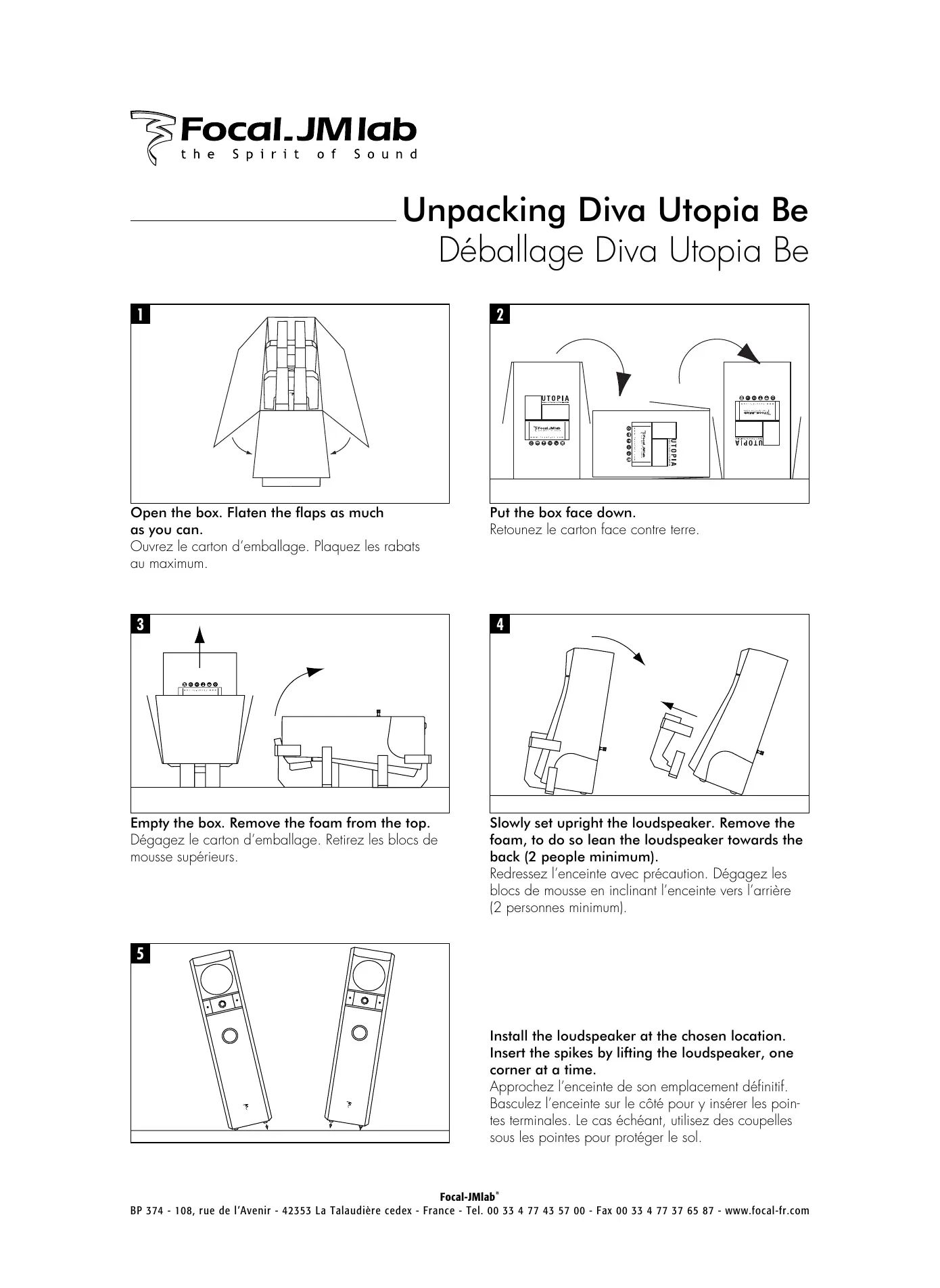Slowly set upright the loudspeaker. Remove the foam, to do so lean the loudspeaker towards the back (2 people minimum). Redressez l'enceinte avec précaution. Dégagez les blocs de mousse en inclinant l'enceinte vers l'arrière (2 personnes minimum).