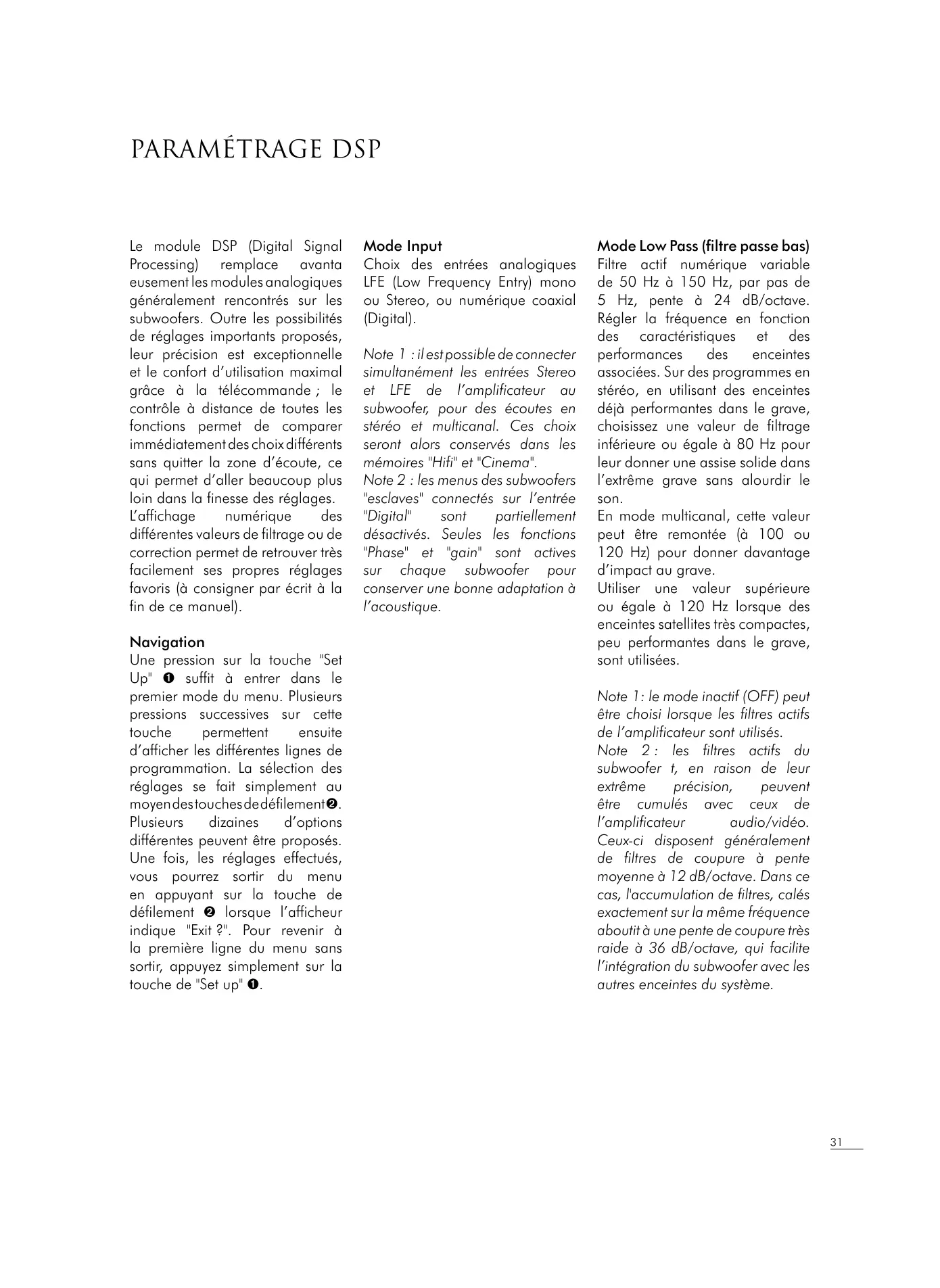 Le module DSP (Digital Signal Processing) remplace avantageusement les modules analogiques généralement rencontrés sur les subwoofer. Outre les possibilités de réglages importants proposés, leur précision est exceptionnelle et le comportement d'utilisation maximal grâce à la télécommande ; le contrôle à distance de toutes les fonctions permet de comparer immédiatement des choix différents sans quitter la zone d'écoute, ce qui permet d'aller beaucoup plus loin dans la finesse des réglages. L'affichage numérique des différentes valeurs de filtrage ou de correction permet de retrouver très facilement ses propres réglages favoris (à consigner par écrit à la fin de ce manuel).
