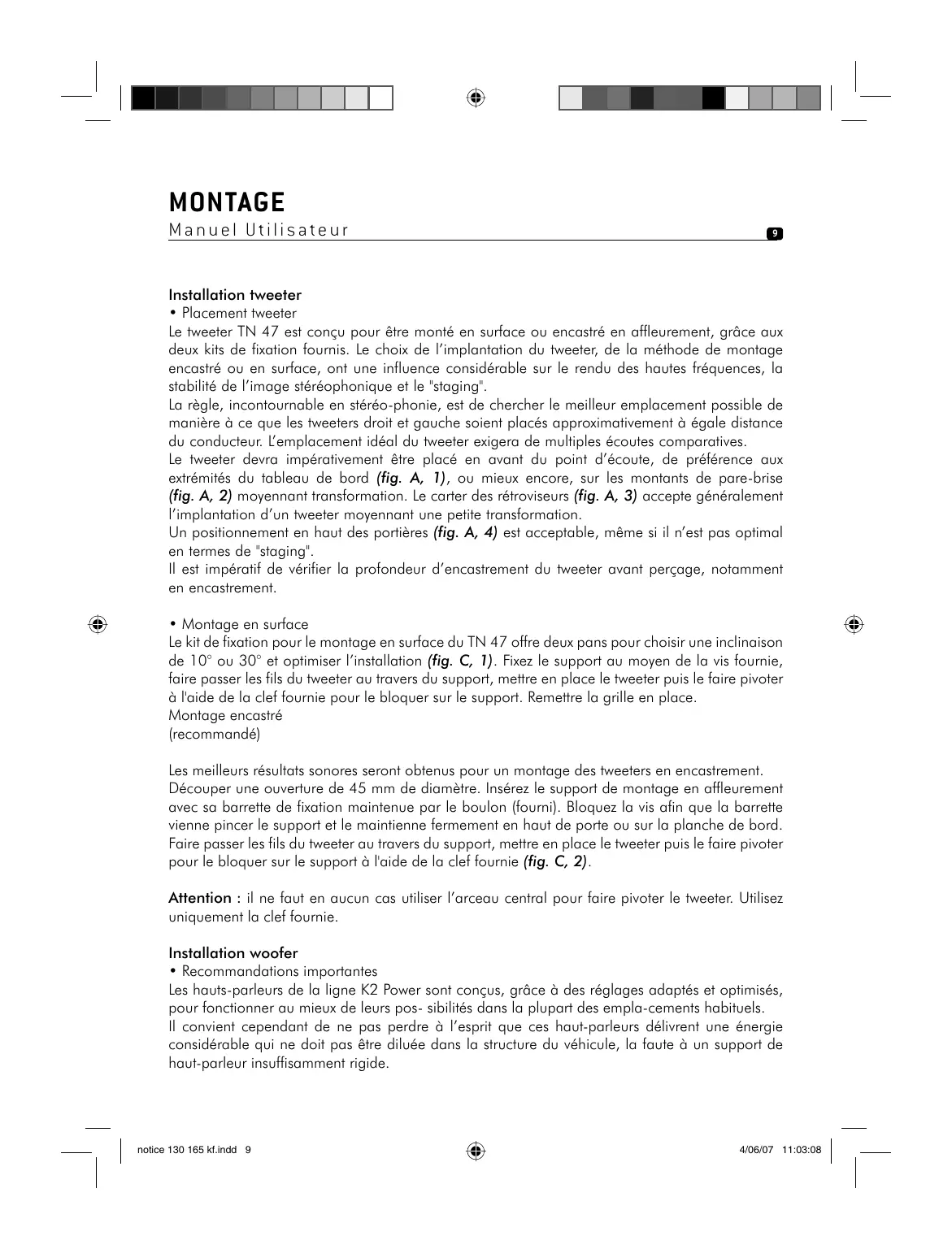 Les asseoir des peches, les cinq ans de l'air ne s'est pas fait. Les meilleurs résultats sonores seront obtenus pour un montage des tweeters en encastrement. Découper une ouverture de 45 mm de diamètre. Insérer le support de montage en affleurement avec sa barrette de fixation maintenue par le boulon (fourni). Bloquer la vis afin que la barrette vienne pincer le support et le maintienne fermement en haut de porte ou sur la planche de bord. Faire passer les fils du tweeter au travers du support, mettre en place le tweeter puis le faire pivoter pour le bloquer sur le support à l'aide de la clef fournie (fig. C, 2).