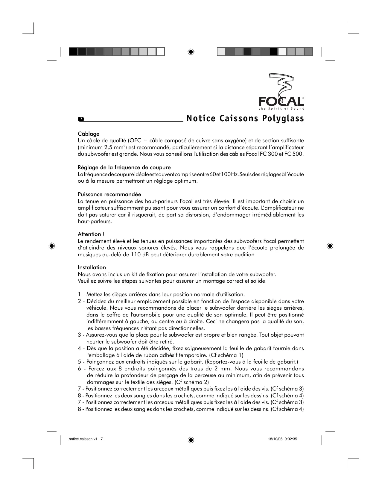 Nous vous remercions d'avoir choisi Focal. Afin de tirer le meilleur parti de vos subwoofer, nous vous recommendons de suivre ces conseils. Tout problème du à un non respect des règles suivantes pourrait entraîner une non validité de la garantie.