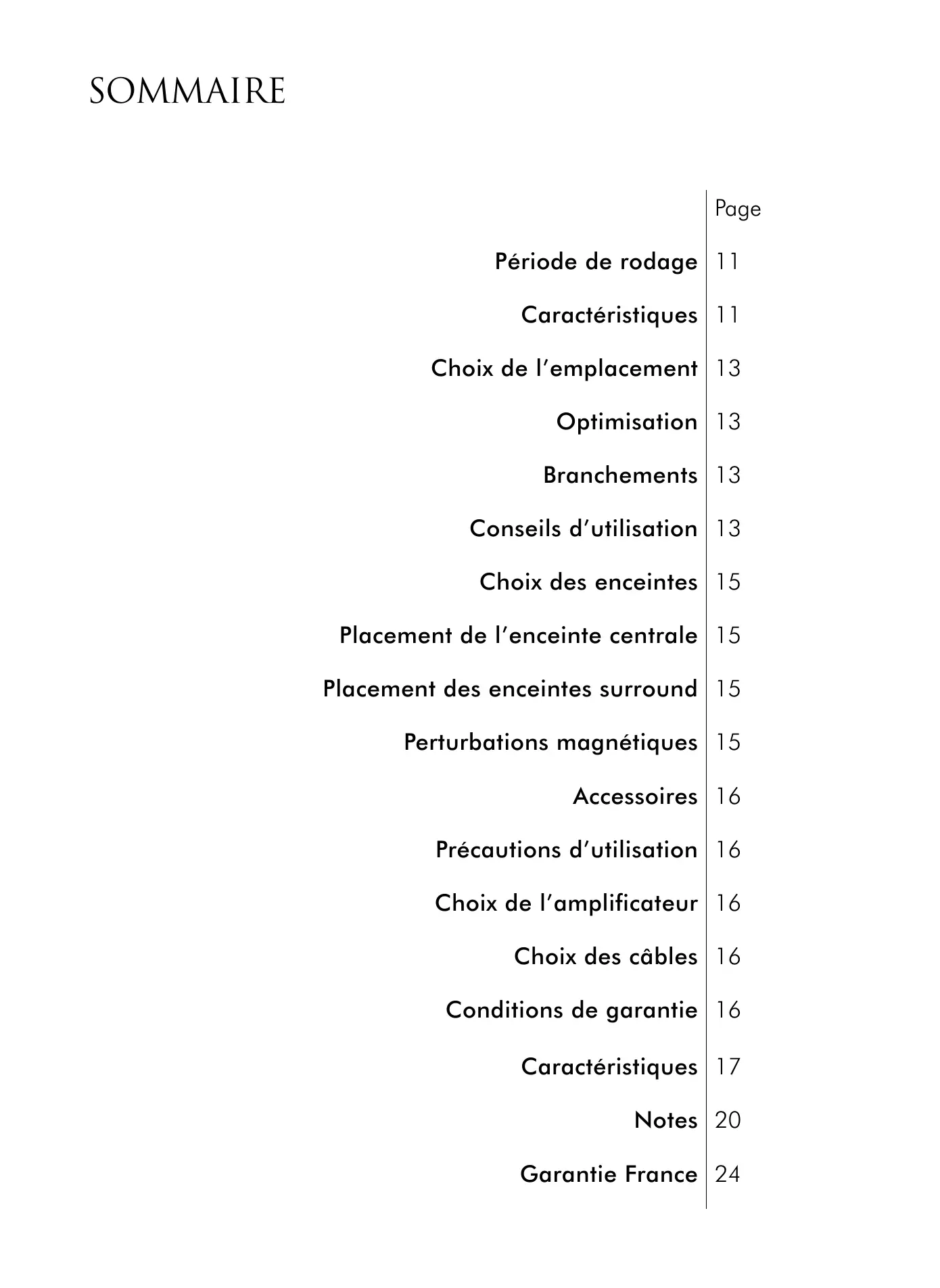 Sommaire Page Période de rodage 11 Caractéristiques 11 Choix de l’emplacement 13 Optimisation 13 Branchements 13 Conseils d’utilisation 13 Choix des enceintes 15 Placement de l’enceinte centrale 15 Placement des enceintes surround 15 Perturbations magnétiques 15 Accessoires 16 Précautions d’utilisation 16 Choix de l’amplificateur 16 Choix des câbles 16 Conditions de garantie 16 Caractéristiques 17 Notes 20 Garantie France 24 manuel d’utilisation profile Nous vous remercions d’avoir choisi les enceintes Profile et de partager avec nous notre philosophie "the Spirit of Sound". Ces enceintes de haute technicité intègrent les ultimes perfectionnements Focal-JMlab en matière de conception de haut-parleurs pour la haute fidélité et le home cinéma. Afin d’exploiter toutes leurs performances, nous vous conseillons de lire les instructions de ce livret puis de le conserver avec précaution pour vous y référer ultérieurement. Pour validation de la garantie Focal-JMlab, merci de nous retourner la garantie jointe dans les 10 jours. Période de rodage Les haut-parleurs utilisés dans Profile sont des éléments mécaniques complexes qui exigent une période d’adaptation pour fonctionner au mieux de leurs possibilités et s’adapter aux conditions de température et d’humidité de votre environnement. Cette période de rodage varie selon les conditions rencontrées et peut se prolonger sur quelques semaines. Pour accélérer cette opération, nous vous conseillons de faire fonctionner vos enceintes une vingtaine d’heures à niveau moyen, sur des programmes musicaux standards mais chargés en grave. Une fois les caractéristiques de l’enceinte totalement stabilisées, vous pourrez profiter intégralement des performances de vos enceintes. Caractéristiques Tweeter à dôme inversé en aluminium magnésium technologie dôme inversé exclusive à Focal, permettant un transfert optimal de l’énergie. L’alliage aluminium / magnésium du dôme à suspension rapportée en Poron® garantit des performances exceptionnelles, pour un aigu à la fois doux et dynamique jusqu’à 30 kHz. Woofer et médium à cône "W" : la technologie des membranes composite "W" est un brevet Focal. Le sigle "W" signifie Verre-Verre, car il s’agit de deux feuilles de verre apposées de part et d’autre du corps central en mousse. Profile utilise la dernière évolution de la membrane "W" pour un contrôle ultra-précis des paramètres selon le dosage des voiles de verre et de l’épaisseur de la mousse. Construction Multiplis de MDF cintrée : nouveau procédé de fabrication en multiplis de panneaux MDF successifs et cintrés sous presse pour une esthétique moderne et un excellent rendu du grave (absence d’ondes stationnaires) ; Filtre à phase optimisée OPC® : optimisation de la phase pour une image sonore précise, stable et naturelle. Évent profilé avant et arrière : grave puissant sans distorsion. Ouate acoustique haute efficacité : excellent amortissement interne, grave tenu et plus profond. Vis de fixation en inox : inaltérables même en climat humide. Connexions haute fiabilité. Pointes de découplage fournies. Focal- JMlab ® - BP 374 - 108, rue de l'Avenir - 42353 La Talaudière cedex - France - www.focal-fr.com Tél. (+33) 04 77 43 57 00 - Fax (+33) 04 77 37 65 87 mise en œuvre