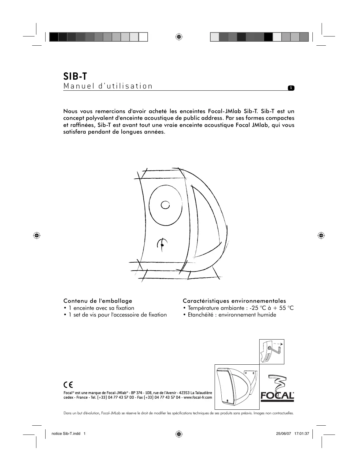 Nous vous remercions d'avoir acheté les enceintes Focal-JMlab Sib-T. Sib-T est un concept polyvalent d'enceinte acoustique de public address. Par ses formes compactes et raffinées, Sib-T est avant tout une vraie enceinte acoustique Focal JMlab, qui vous satisfera pendant de longues années.