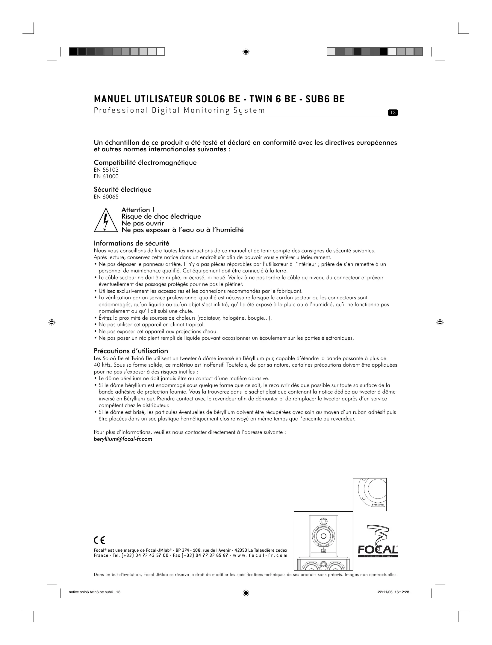 Les enceintes Solo6 Be et Twin6 Be, ainsi que le caisson de grave Sub6 Be constituent un système d'écoute de contrôle professionnel de haute performances et nous vous remercions d'avoir choisi Focal. Ces produits ont été conçus pour allier image sonore impeccable, extrême précision et réponse en fréquence étendue, dans un format compact adapté à des écoutes de proximité.