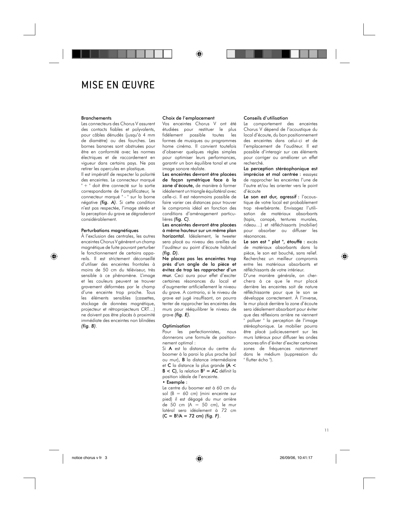 Branchements Les connecteurs des Chorus V assurent des contacts fiables et polyvalents, pour câbles dénudés (iusqu'à 4 mm de diamètre) ou des fourches. Les bornes bananes sont obstruées pour être en conformité avec les normes électriques et de raccordement en vigueur dans certains pays. Ne pas retirer les opercules en plastique Il est impératif de respecter la polarité des enceintes. Le connecieur marqué "+" doit être connecté sur la sortie correspondante de l'amplificateur, le connecteur marqué " -" sur la borne négalive (fig. A). Si celte condition n'est pas respectée, l'image stéréo et la perception du grave se dégraderont considérablement. Perturbations magnétiques À l'exclusion des centrales, les autres enceintes Chorus V génèrent un champ magnétique de fuite pouvant perturber le fonctionnement de certains appa- rails. Il est strictement déconseillé d'uiliser des enceintes frontales à moins de 50 cm du téléviseur, très sensible à ce phénomène. l'image et les couleurs peuvent se trouver gravement déformées par le champ d'une enceinte trop proche. Tous les éléments sensibles (cassettes, stockage de données magnétique, projecteur et rélroprojecteurs CRT...) ne doivent pas être placés à proximité immédiate des enceintes non blindées (fig. B) notice chorus vtr 3 | SRRREMMENT T © Choix de l'emplacement Vos enceintes Chorus V ont été étudiées pour reslituer le plus fidèlement possible toutes les formes de musiques ou programmes home cinéma. Il convient toutefois d'observer quelques règles simples pour oplimiser leurs performances, garantir un bon équilibre tonal et une image sonore réaliste Les enceintes devront être placées de façon symétrique face à la zone d'écoute, de manière à former idéalement un Iriangle équilatéral avec: celle-ci. Il est néanmoins possible de faire varier ces distances pour trouver le compromis idéal en fonclion des conditions d'aménagement paricu- lières (fig. C) Les enceintes devront être placées à même hauteur sur un même plan horizontal. Idéalement, le iveeter sera placé au niveau des oreilles de l'auditeur au point d'écoute habituel (fig. D). Ne placez pas les enceintes trop près d'un angle de la pièce et évitez de trop les rapprocher d’un mur. Ceci aura pour effet d'exciter cenaines résonances du local et d'augmenter artificiellement le niveau du grave. À contrario, si le niveau de grave est jugé insuffisant, on pourra enter de rapprocher les enceintes des murs pour rééquilibrer le niveau de grove (fig. E). Optimisation Pour les perfectionnisies, nous donnerons une formule de position nement optimal Si A est la distance du centre du boomer à la paroi la plus proche (sol ou mur, B lo distance intermédiaire et C la distance la plus grande (A < B < C), la relation B? = AC définit la position idéale de l'enceinte. + Exemple Le centre du boomer est à 60 cm du sol (B — 60 cm} (mini enceinte sur pied) il est dégagé du mur arrière de 50 cm (A = 50 cm}, le mur latéral sera idéalement à 72 cm (C = BYA = 72 cm) (fig. F) Conseils d'utilisation Le comporiement des _ enceintes Chorus V dépend de l'acoustique du local d'écoute, du bon positionnement des enceintes dans celui-ci et de l'emplacement de l'auditeur. Il est possible d’interagir sur ces éléments pour corriger ou améliorer un effet recherché La perception stéréophonique est imprécise et mal centrée : essayez de rapprocher les enceintes l'une de l'autre et/ou les orienter vers le point d'écoute Le son est dur, agressif : l'acous- lique de votre local est probablement rop_ réverbérante. Envisagez l'utli- solion de matériaux absorbants (iopis, canapé, tentures murales, rideau. et réfléchissants (mobilier) pour absorber ou diffuser les résonances. Le son est " plat ", étouffé : excès de matériaux absorbants dans la pièce, le son est bouché, sans reliet. Recherchez un meilleur compromis entre les maïériaux absorbants et réfléchissants de voire intérieur. D'une manière générale, on cher- chera à ce que le mur placé derrière les enceintes soit de nature réfléchissante pour que le son se développe correctement. À l'inverse, le mur placé derrière la zone d'écoute sera idéalement absorbant pour éviter que des réflexions arrière ne viennent " polluer * la perception de l'image stéréophonique. Le mobilier pourra être placé judicieusement sur les murs latéraux pour diffuser les ondes sonores afin d'éviter d'exciter ceriaines zones de fréquences notamment dans le médium (suppression du lutter écho 1 26/09/06, 10:41:17