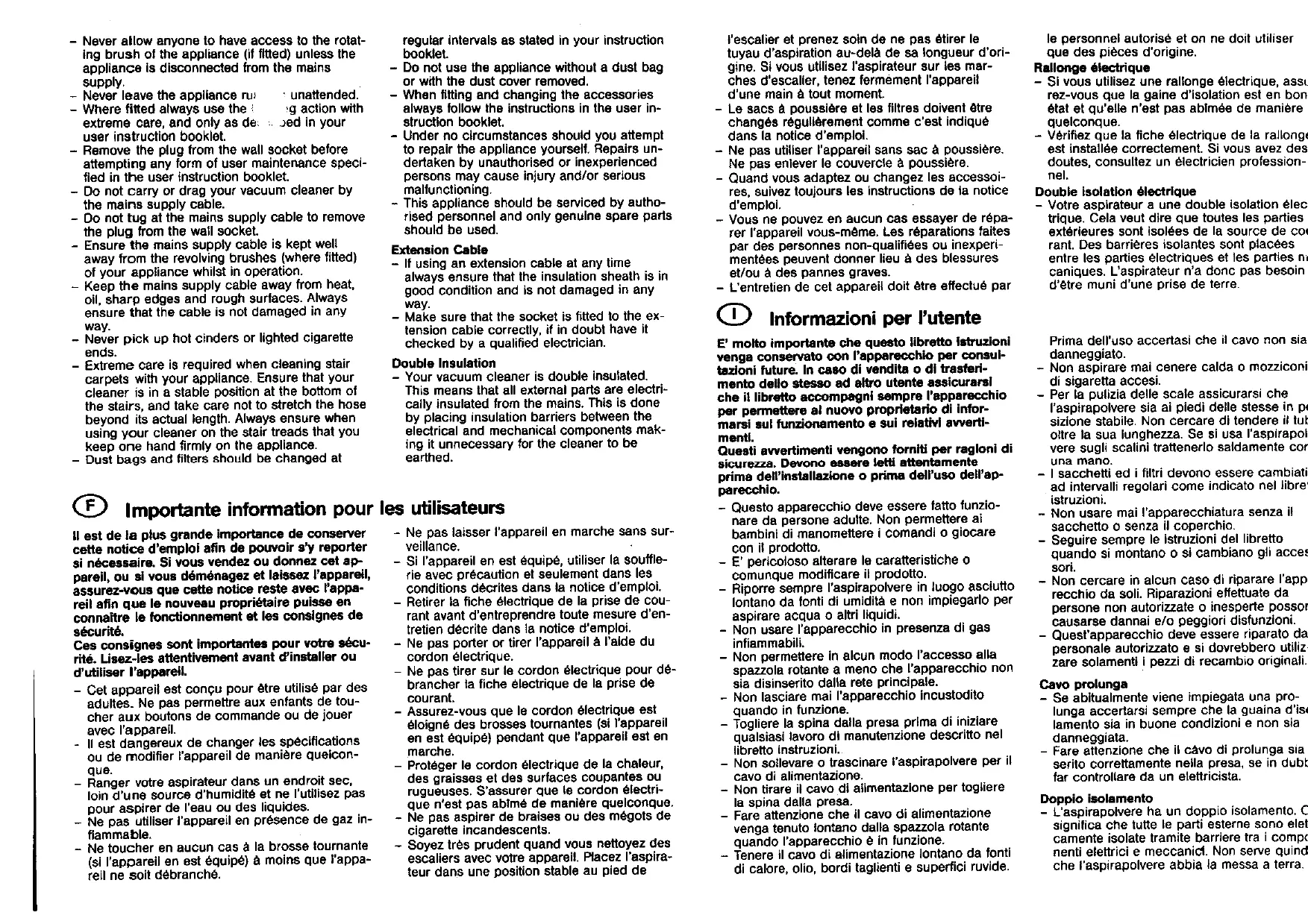- Le sac à poussière et les filtres doivent être changés régulièrement comme indiqué dans la notice d'emploi.
