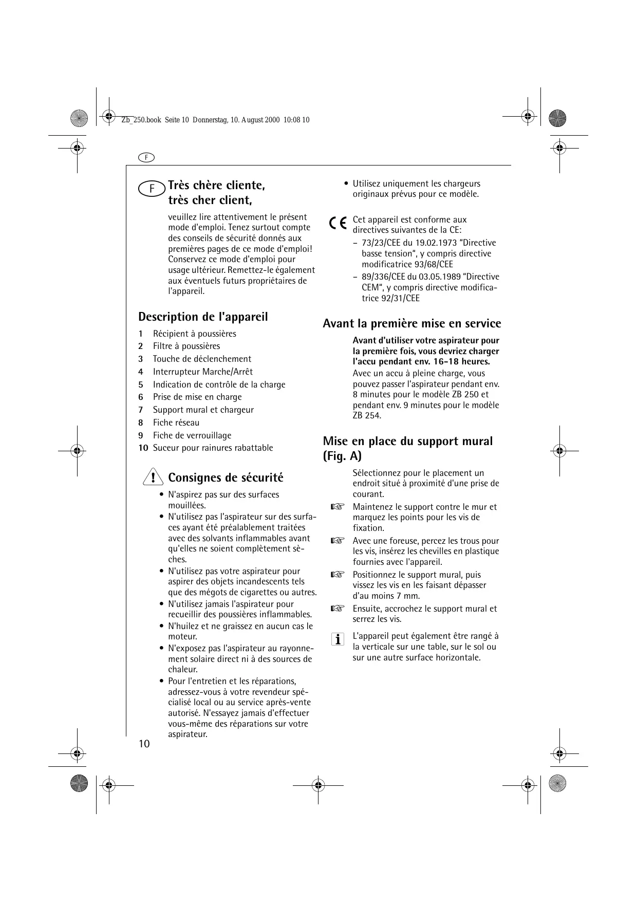 Avec un accu à pleine charge, vous pouvez passer l'aspirateur pendant env. 8 minutes pour le modèle ZB 250 et pendant env. 9 minutes pour le modèle ZB 254.