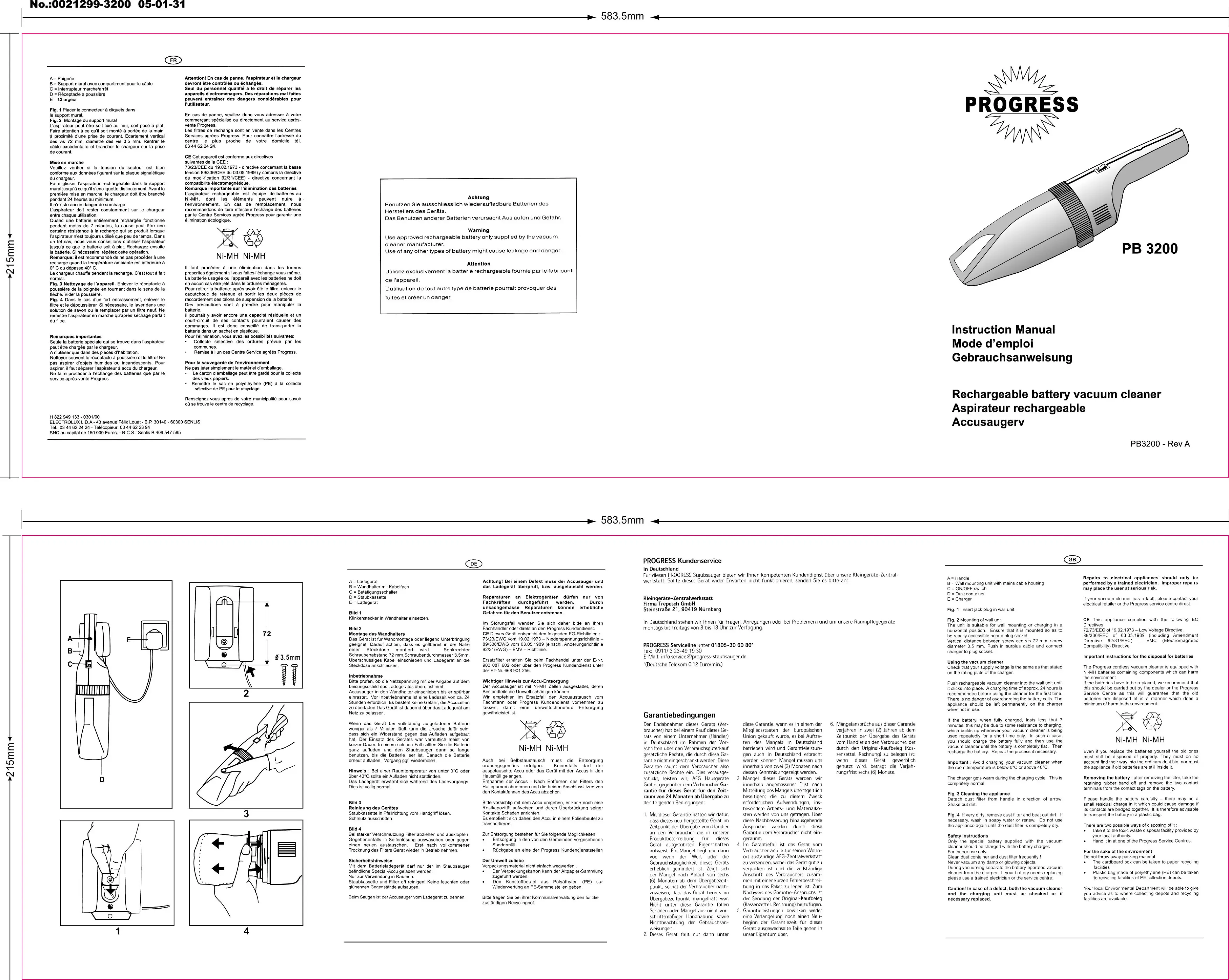Remarque importante sur l'élimination des batteries L'aspirateur rechargeable est équipé de batteries au Ni-MH, dont les éléments peuvent nuir à l'environnement. En cas de remplacement, nous recommando de faire effeteur l'échange des batteries par le Centre Services agéré Progress pour garantir une élimination ecologique.