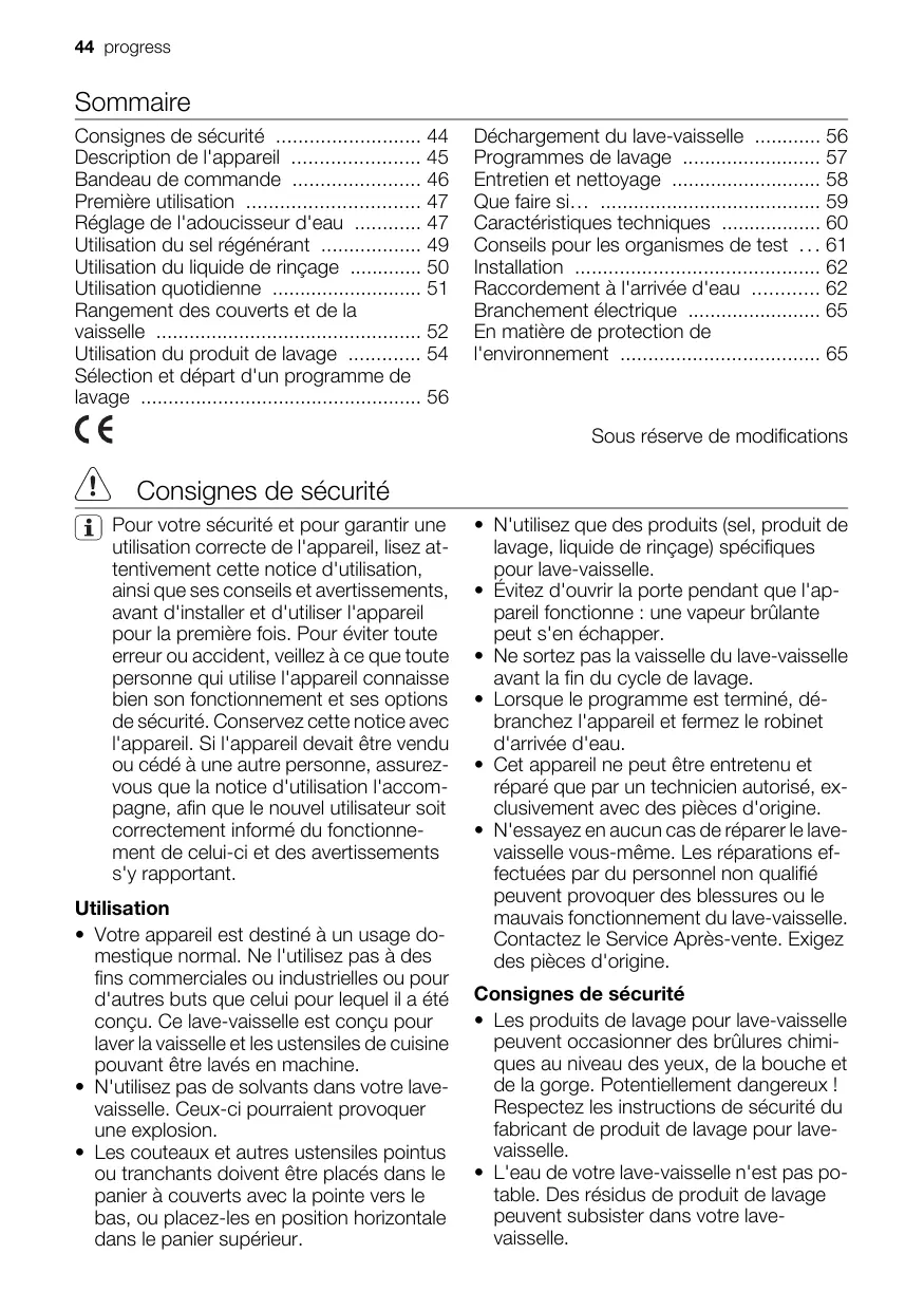 - Verwijder het slot van de deur. Zo voorkomt u dat kinderen zichzelf insluiten en hun leven in gevaar brengen. 44 progress Sommaire Consignes de sécurité .......................... 44 Description de l'appareil ....................... 45 Bandeau de commande ....................... 46 Première utilisation ............................... 47 Réglage de l'adoucisseur d'eau ............ 47 Utilisation du sel régénérant .................. 49 Utilisation du liquide de rinçage ............. 50 Utilisation quotidienne ........................... 51 Rangement des couverts et de la vaisselle ................................................ 52 Utilisation du produit de lavage ............. 54 Sélection et départ d'un programme de lavage ................................................... 56 Déchargement du lave-vaisselle ............ 56 Programmes de lavage ......................... 57 Entretien et nettoyage ........................... 58 Que faire si… ........................................ 59 Caractéristiques techniques .................. 60 Conseils pour les organismes de test . . . 61 Installation ............................................ 62 Raccordement à l'arrivée d'eau ............ 62 Branchement électrique ........................ 65 En matière de protection de l'environnement .................................... 65 Sous réserve de modifications Consignes de sécurité Pour votre sécurité et pour garantir une utilisation correcte de l'appareil, lisez attentivement cette notice d'utilisation, ainsi que ses conseils et avertissements, avant d'installer et d'utiliser l'appareil pour la première fois. Pour éviter toute erreur ou accident, veillez à ce que toute personne qui utilise l'appareil connaisse bien son fonctionnement et ses options de sécurité. Conservez cette notice avec l'appareil. Si l'appareil devait être vendu ou cédé à une autre personne, assurezvous que la notice d'utilisation l'accompagne, afin que le nouvel utilisateur soit correctement informé du fonctionnement de celui-ci et des avertissements s'y rapportant. Utilisation