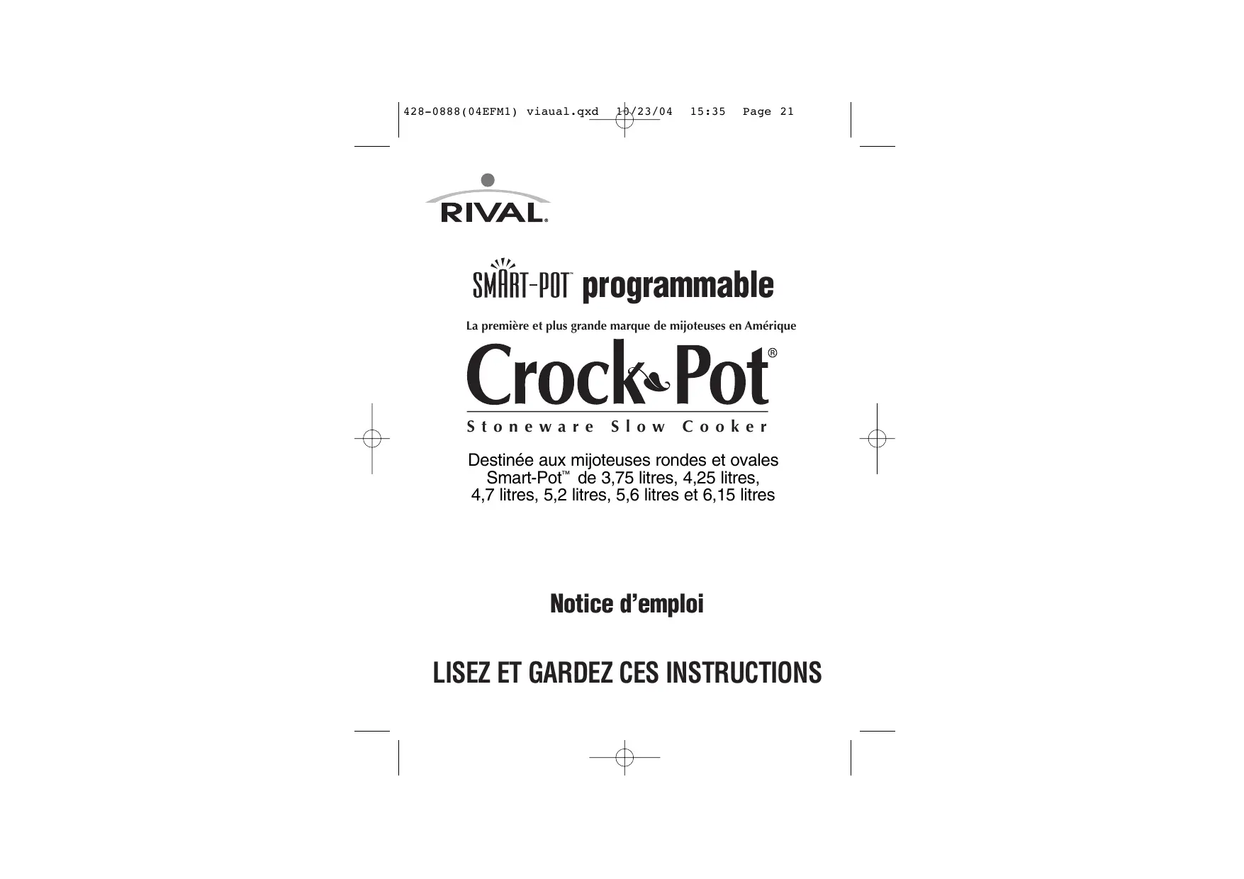 Cet appareil est équipé d’une fiche polarisée (ayant une lame plus large que l’autre). Par mesure de sécurité, elle ne peut être insérée dans les prises de courant polarisées que d’une façon. Si la fiche ne rentre pas bien dans la prise, inversez-la. Si vous ne réussissez toujours pas, faites changer la prise par un électricien. Ne tentez de modifier le dispositif de sécurité de la fiche en aucune façon. Si la fiche rentre dans la prise mais qu’il y ait du jeu ou bien si la prise de courant alternatif vous semble chaude, ne vous en servez pas de cette prise. REMARQUE IMPORTANTE : Certains plans de travail - dont ceux de marque Corian® - ne supportent pas la douce chaleur qui se dégage des mijoteuses Crock-Pot®. En présence de ce genre de surface, nous conseillons d'employer un coussin insensible à la chaleur ou un dessous-de-plat. Rival® n'assume aucune responsabilité en ce qui concerne l'endommagement de telles surfaces. 428-0888(04EFM1) viaual.qxd 10/23/04 15:35 Page 24 MODE D’EMPLOI DE LA MIJOTEUSE SMART-POT™