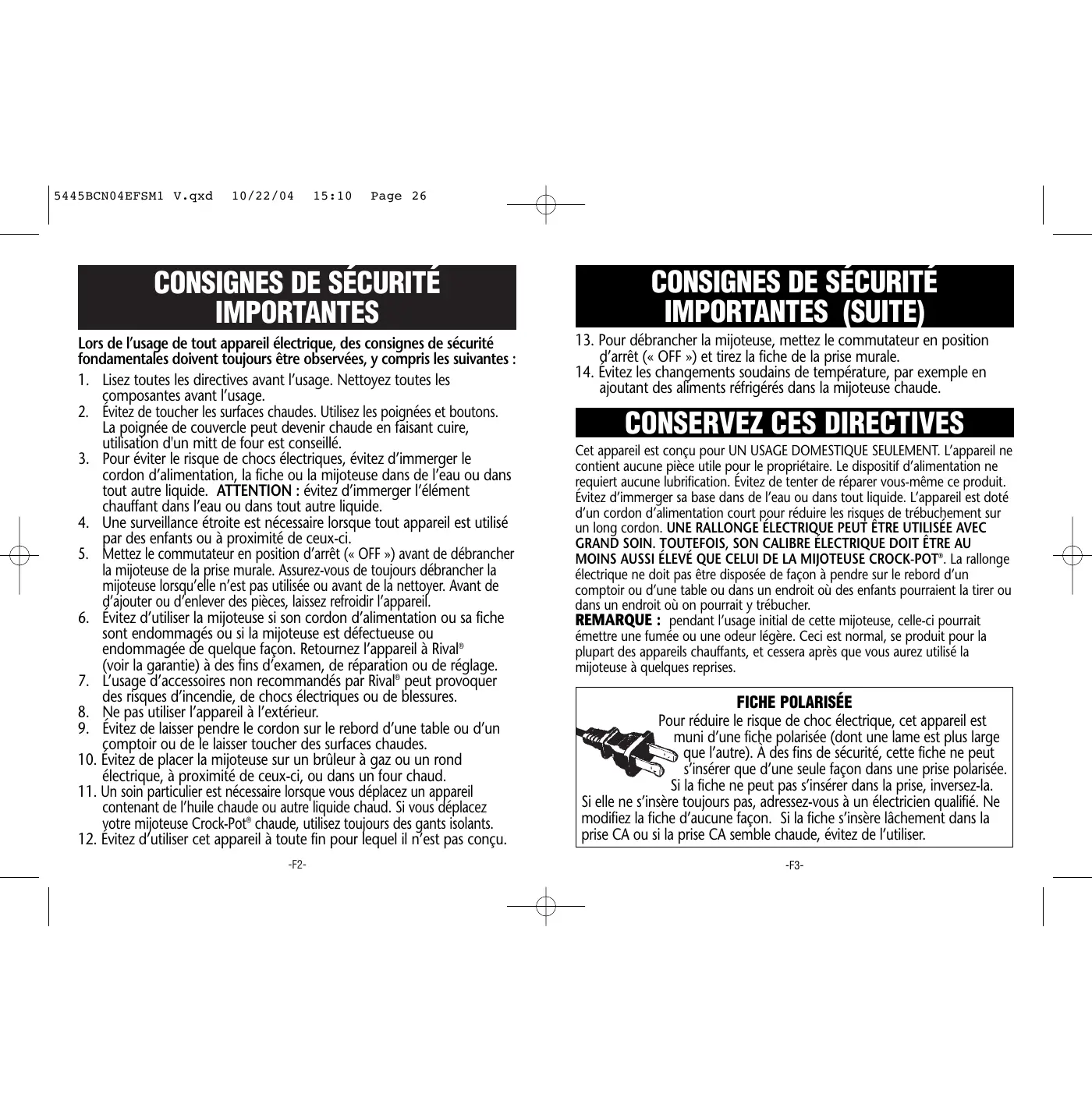 Pour réduire le risque de choc électrique, cet appareil est muni d’une fiche polarisée (dont une lame est plus large que l’autre). À des fins de sécurité, cette fiche ne peut s’insérer que d’une seule façon dans une prise polarisée. Si la fiche ne peut pas s’insérer dans la prise, inversez-la. Si elle ne s’insère toujours pas, adressez-vous à un électricien qualifié. Ne modifiez la fiche d’aucune façon. Si la fiche s’insère lâchement dans la prise CA ou si la prise CA semble chaude, évitez de l’utiliser. -F3- 5445BCN04EFSM1 V.qxd 10/22/04 15:10 Page 28 REMARQUE IMPORTANTE : Certains plans de travail - dont ceux de marque Corian® - ne supportent pas la douce chaleur qui se dégage des mijoteuses Crock-Pot®. En présence de ce genre de surface, nous conseillons d'employer un coussin insensible à la chaleur ou un dessous-de-plat. Rival® n'assume aucune responsabilité en ce qui concerne l'endommagement de telles surfaces.