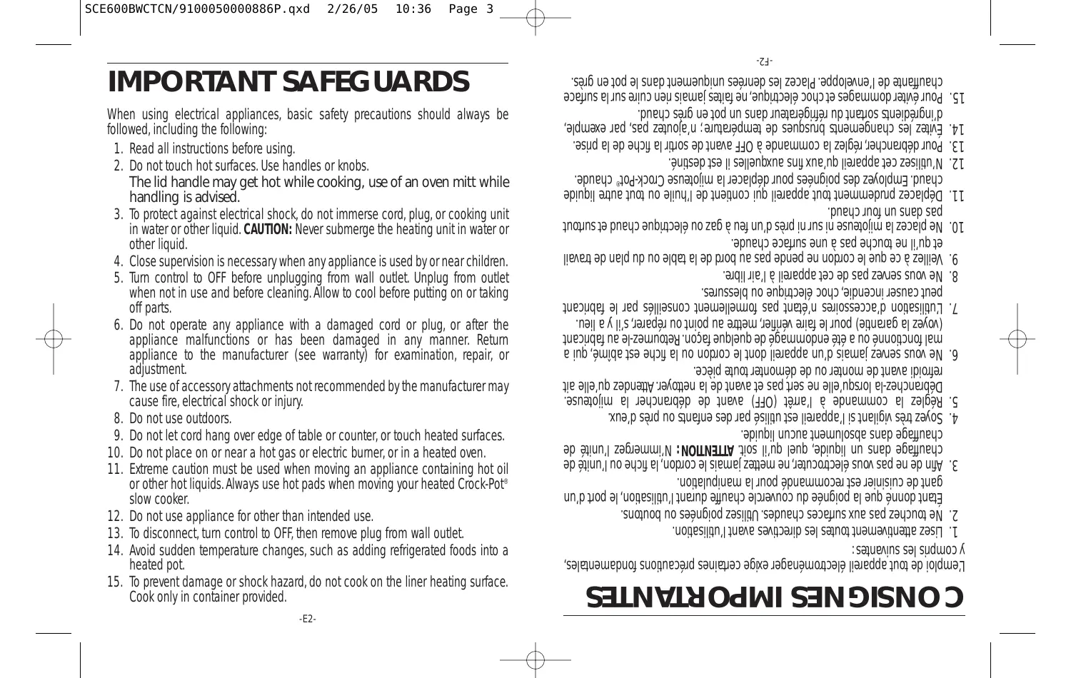 2/26/05 Crock-Pot®, le logo Crock-Pot LogoTM, Rival® et le logo Rival Logo® sont des marques de commerce de The Holmes Group, Inc. ou de sa filiale. Imprimé en Chine SCE600BWCT-CN/9100050000886