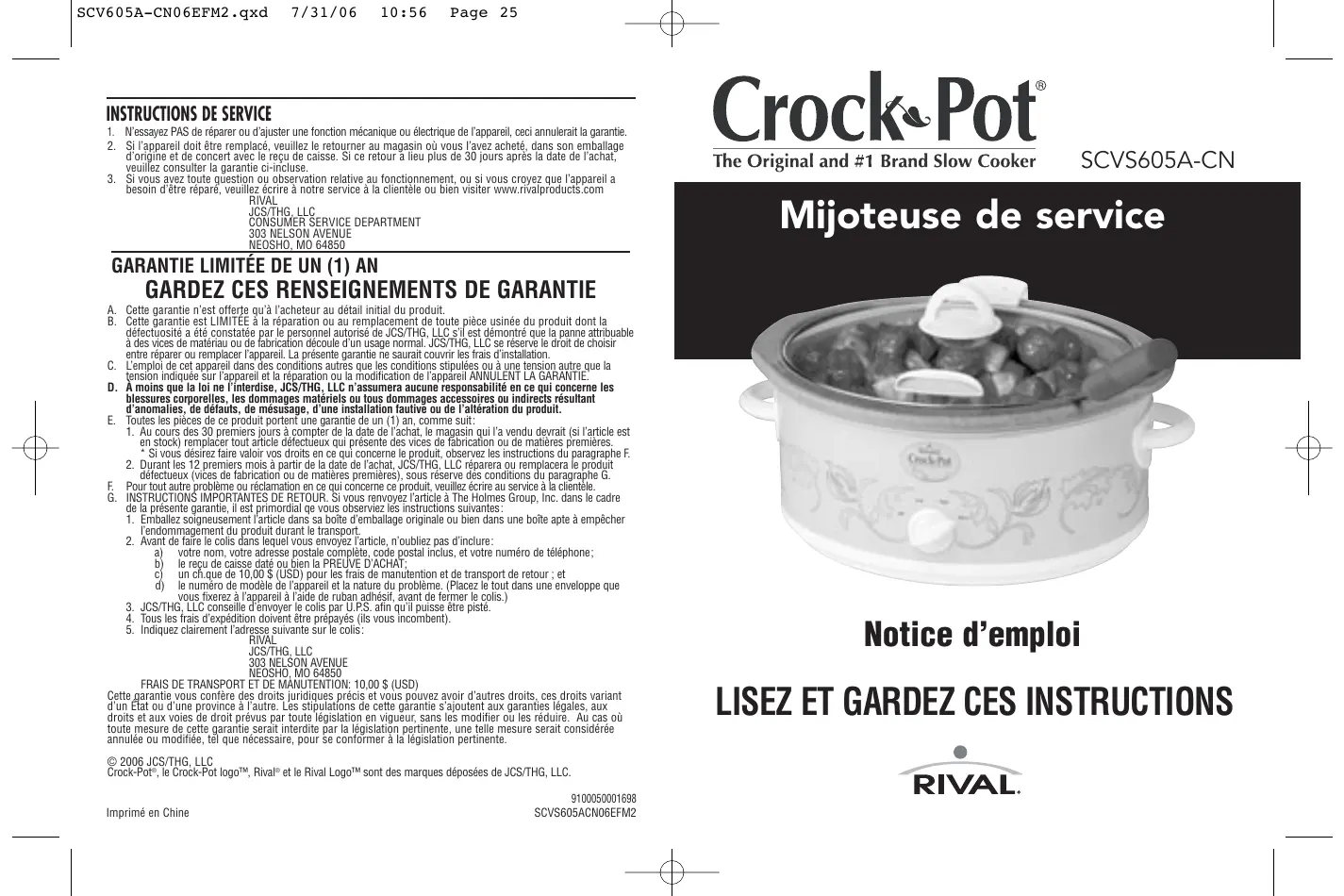 Crock-Pot®, le Crock-Pot logo™, Rival® et le Rival Logo™ sont des marques déposées de JCS/THG, LLC. Imprimé en Chine