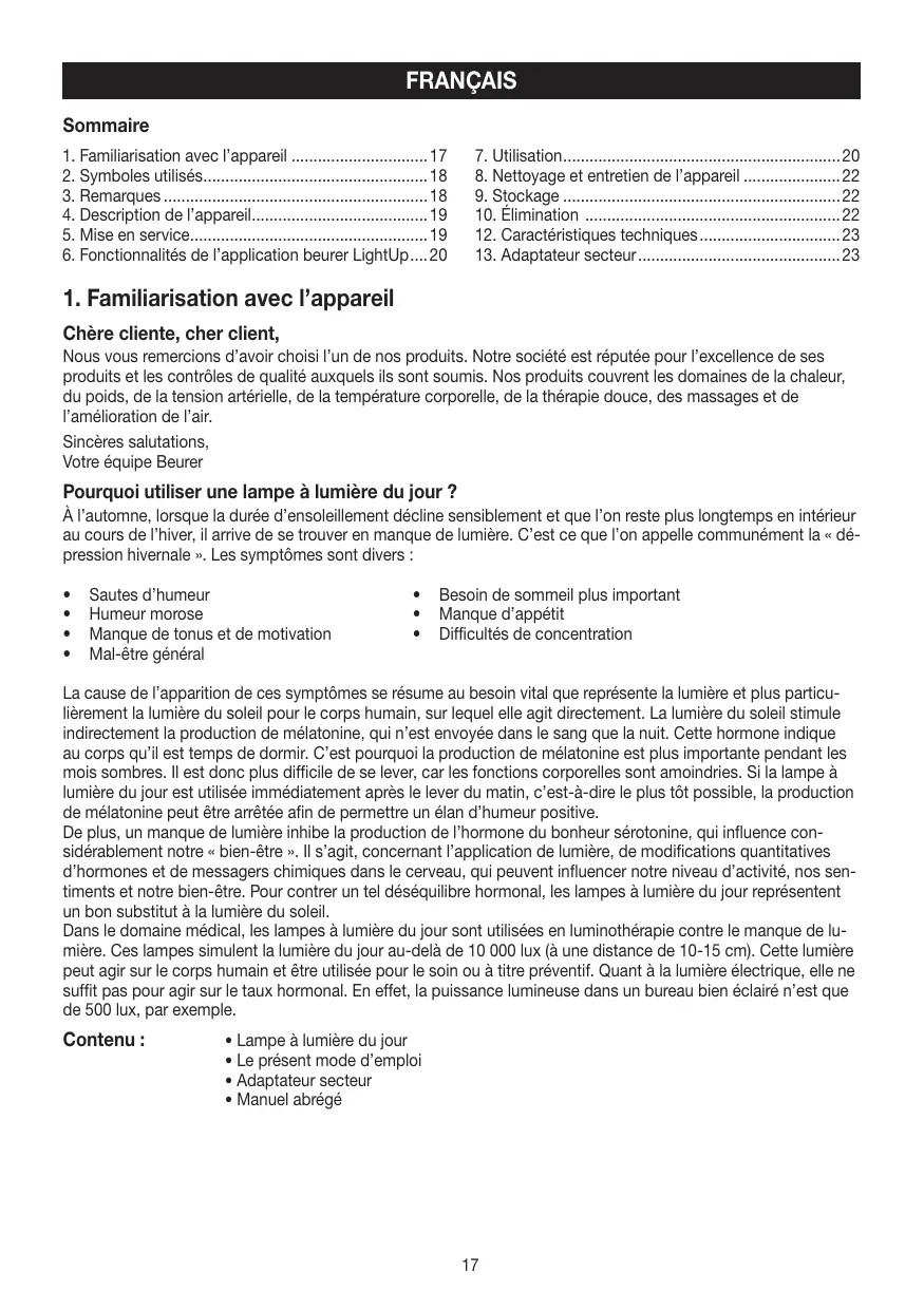 Chère cliente, cher client, Nous vous remercions d’avoir choisi l’un de nos produits. Notre société est réputée pour l’excellence de ses produits et les contrôles de qualité auxquels ils sont soumis. Nos produits couvrent les domaines de la chaleur, du poids, de la tension artérielle, de la température corporelle, de la thérapie douce, des massages et de l’amélioration de l’air. Sincères salutations, Votre équipe Beurer Pourquoi utiliser une lampe à lumière du jour ? À l’automne, lorsque la durée d’ensoleillement décline sensiblement et que l’on reste plus longtemps en intérieur au cours de l’hiver, il arrive de se trouver en manque de lumière. C’est ce que l’on appelle communément la « dépression hivernale ». Les symptômes sont divers :