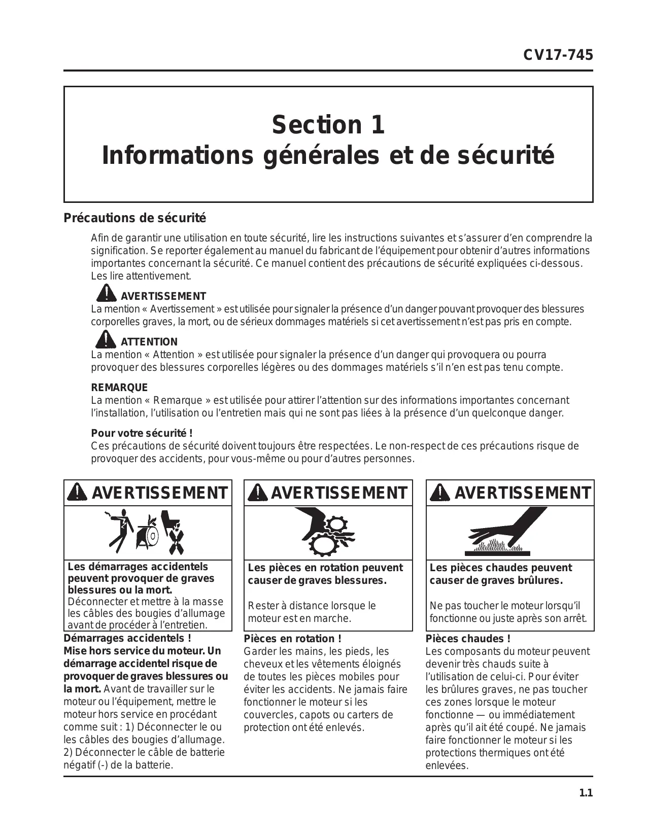 Pièces chaudes ! Les composants du moteur peuvent devenir très chauds suite à l’utilisation de celui-ci. Pour éviter les brûlures graves, ne pas toucher ces zones lorsque le moteur fonctionne — ou immédiatement après qu’il ait été coupé. Ne jamais faire fonctionner le moteur si les protections thermiques ont été enlevées. 1.1