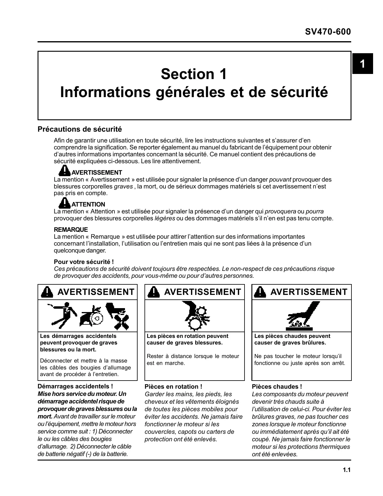 Garder les mains, les pieds, les cheveux et les vêtements éloignés de toutes les pièces mobiles pour éviter les accidents. Ne jamais faire fonctionner le moteur si les couvercles, capots ou carters de protection ont été enlevés.