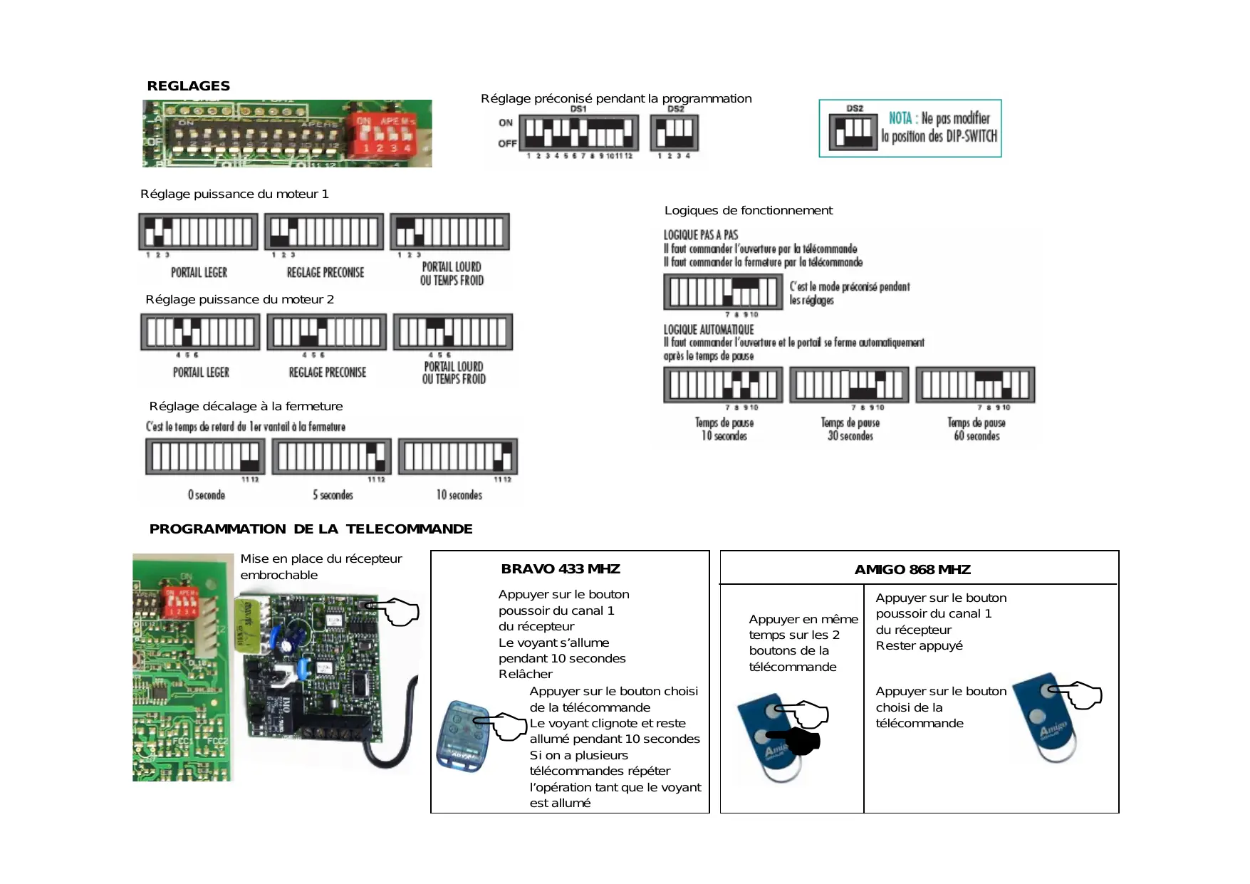 3 PONTS INDISPENSABLES RECEPTEUR EMETTEUR BRANCHEMENT CELLULES actives à la fermeture BRANCHEMENT SELECTEUR à CLE BRANCHEMENT CLIGNOTANT Ouverture Ouverture 1 vantail 2 vantaux REGLAGES Réglage préconisé pendant la programmation Réglage puissance du moteur 1 Logiques de fonctionnement Réglage puissance du moteur 2 Réglage décalage à la fermeture