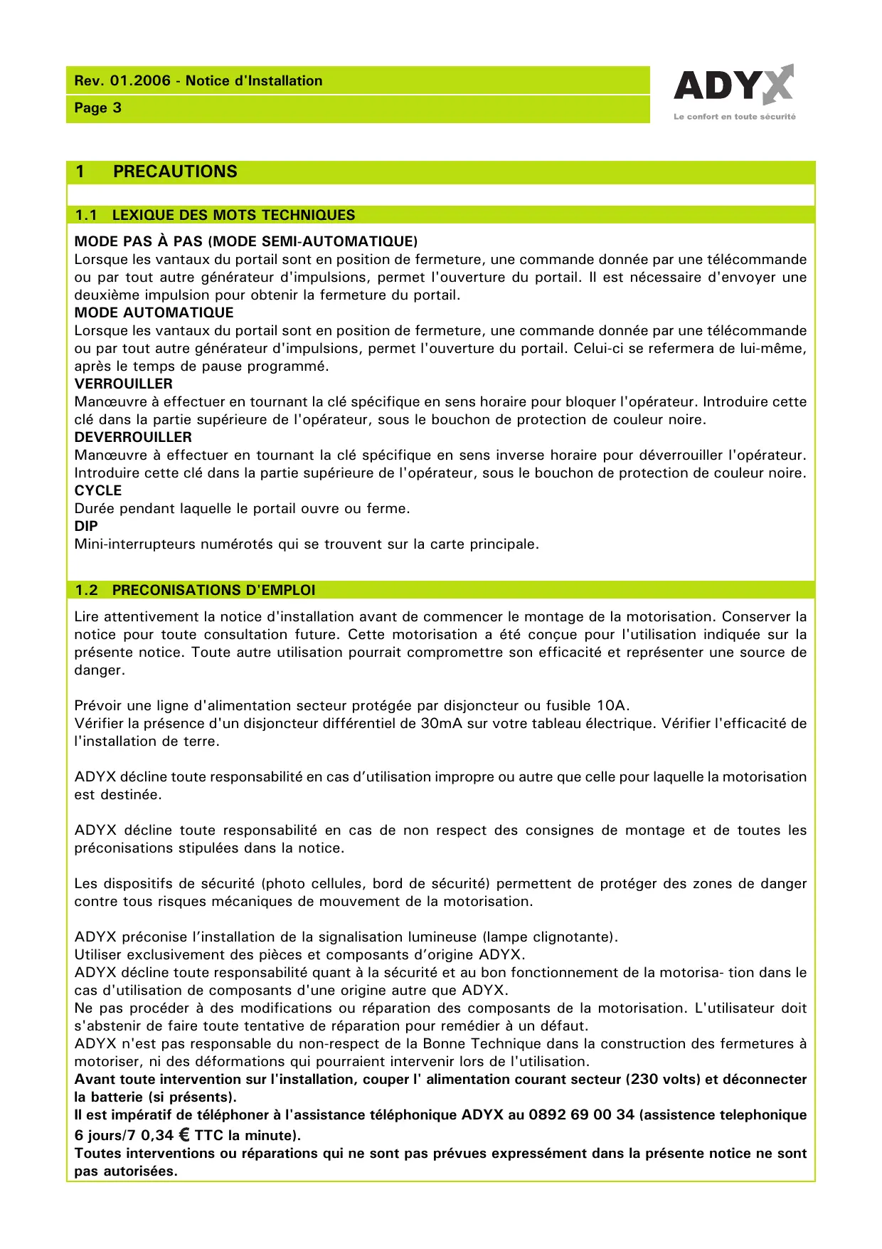 Lire attentivement la notice d'installation avant de commencer le montage de la motorisation. Conserver la notice pour toute consultation future. Cette motorisation a été conçue pour l'utilisation indiquée sur la présente notice. Toute autre utilisation pourrait compromettre son efficacité et représenter une source de danger. Prévoir une ligne d'alimentation secteur protégée par disjoncteur ou fusible 10A. Vérifier la présence d'un disjoncteur différentiel de 30mA sur votre tableau électrique. Vérifier l'efficacité de l'installation de terre. ADYX décline toute responsabilité en cas d’utilisation impropre ou autre que celle pour laquelle la motorisation est destinée. ADYX décline toute responsabilité en cas de non respect des consignes de montage et de toutes les préconisations stipulées dans la notice. Les dispositifs de sécurité (photo cellules, bord de sécurité) permettent de protéger des zones de danger contre tous risques mécaniques de mouvement de la motorisation. ADYX préconise l’installation de la signalisation lumineuse (lampe clignotante). Utiliser exclusivement des pièces et composants d’origine ADYX. ADYX décline toute responsabilité quant à la sécurité et au bon fonctionnement de la motorisa- tion dans le cas d'utilisation de composants d'une origine autre que ADYX. Ne pas procéder à des modifications ou réparation des composants de la motorisation. L'utilisateur doit s'abstenir de faire toute tentative de réparation pour remédier à un défaut. ADYX n'est pas responsable du non-respect de la Bonne Technique dans la construction des fermetures à motoriser, ni des déformations qui pourraient intervenir lors de l'utilisation. Avant toute intervention sur l'installation, couper l' alimentation courant secteur (230 volts) et déconnecter la batterie (si présents). Il est impératif de téléphoner à l'assistance téléphonique ADYX au 0892 69 00 34 (assistence telephonique 6 jours/7 0,34 TTC la minute). Toutes interventions ou réparations qui ne sont pas prévues expressément dans la présente notice ne sont pas autorisées. Rev. 01.2006 - Notice d'Installation Page 4