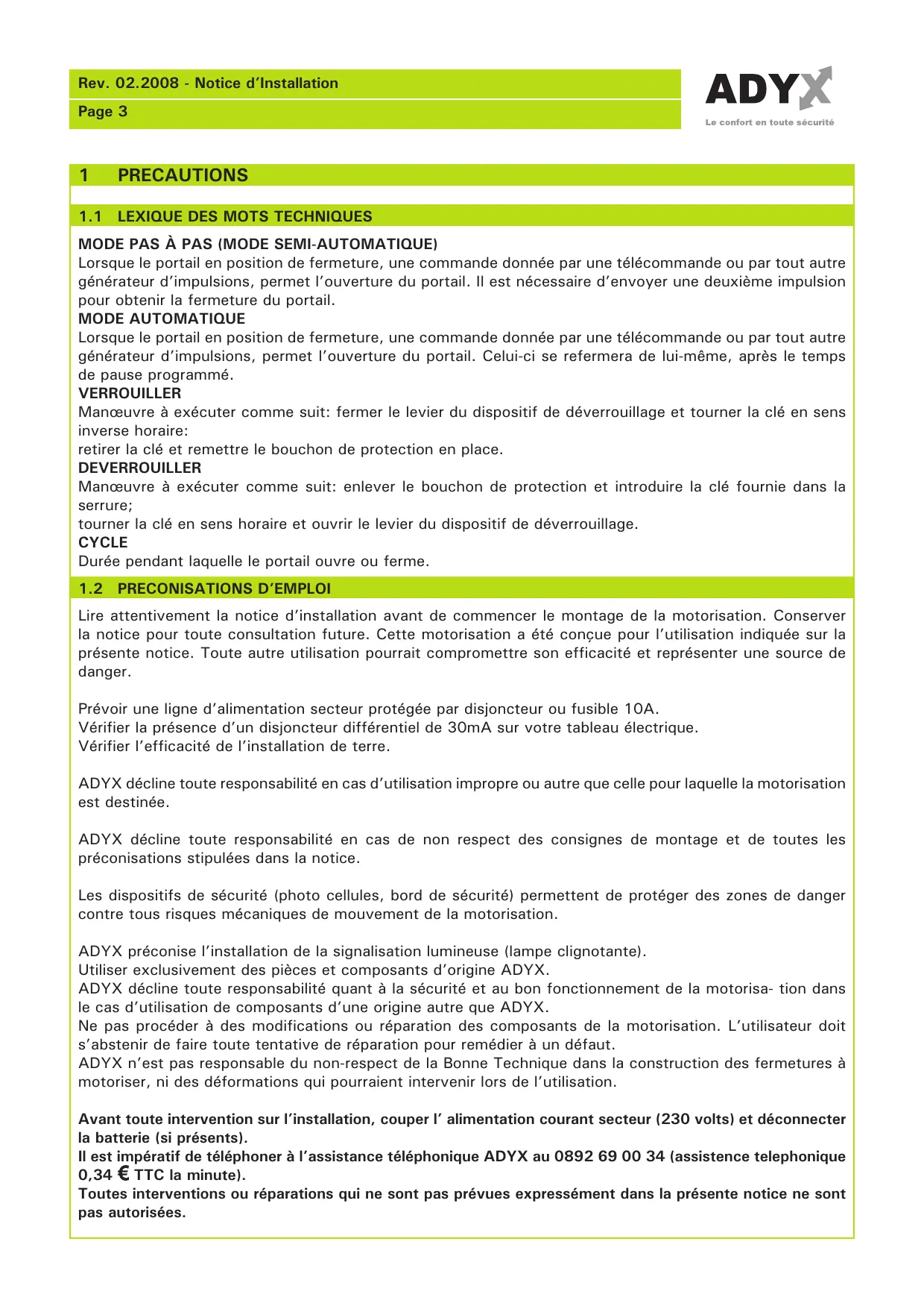 Lire attentivement la notice d’installation avant de commencer le montage de la motorisation. Conserver la notice pour toute consultation future. Cette motorisation a été conçue pour l’utilisation indiquée sur la présente notice. Toute autre utilisation pourrait compromettre son efficacité et représenter une source de danger. Prévoir une ligne d’alimentation secteur protégée par disjoncteur ou fusible 10A. Vérifier la présence d’un disjoncteur différentiel de 30mA sur votre tableau électrique. Vérifier l’efficacité de l’installation de terre. ADYX décline toute responsabilité en cas d’utilisation impropre ou autre que celle pour laquelle la motorisation est destinée. ADYX décline toute responsabilité en cas de non respect des consignes de montage et de toutes les préconisations stipulées dans la notice. Les dispositifs de sécurité (photo cellules, bord de sécurité) permettent de protéger des zones de danger contre tous risques mécaniques de mouvement de la motorisation. ADYX préconise l’installation de la signalisation lumineuse (lampe clignotante). Utiliser exclusivement des pièces et composants d’origine ADYX. ADYX décline toute responsabilité quant à la sécurité et au bon fonctionnement de la motorisa- tion dans le cas d’utilisation de composants d’une origine autre que ADYX. Ne pas procéder à des modifications ou réparation des composants de la motorisation. L’utilisateur doit s’abstenir de faire toute tentative de réparation pour remédier à un défaut. ADYX n’est pas responsable du non-respect de la Bonne Technique dans la construction des fermetures à motoriser, ni des déformations qui pourraient intervenir lors de l’utilisation. Avant toute intervention sur l’installation, couper l’ alimentation courant secteur (230 volts) et déconnecter la batterie (si présents). Il est impératif de téléphoner à l’assistance téléphonique ADYX au 0892 69 00 34 (assistence telephonique 0,34 TTC la minute). Toutes interventions ou réparations qui ne sont pas prévues expressément dans la présente notice ne sont pas autorisées. Rev. 02.2008 - Notice d’Installation Page 4